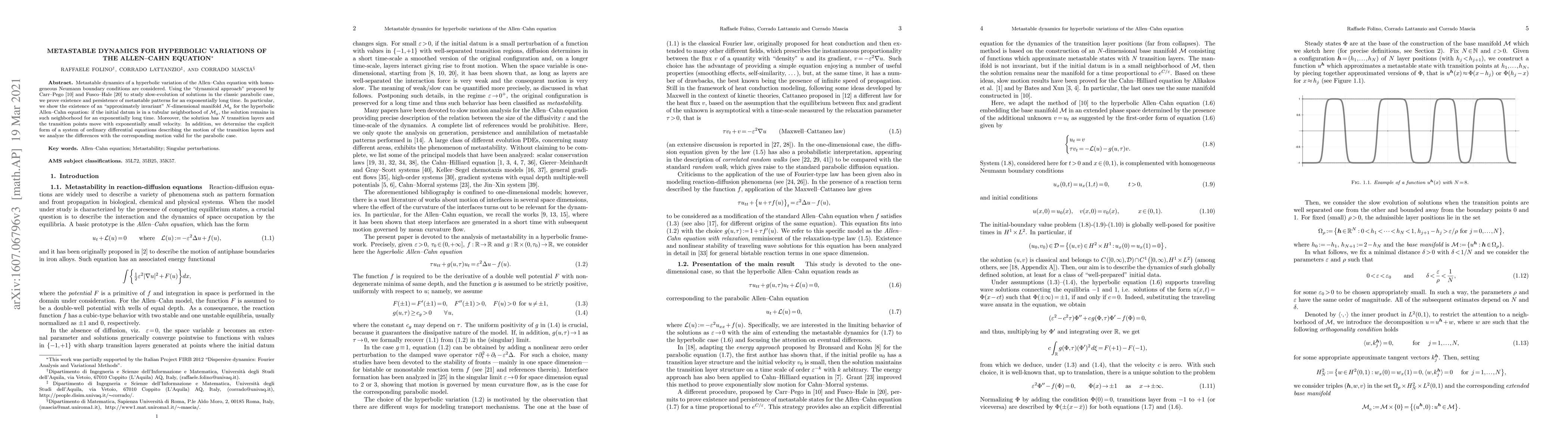 This paper investigates the metastable dynamics of a hyperbolic variation of the Allen-Cahn equation, proving the existence and persistence of metastable patterns for an exponentially long time. It identifies an "approximately invariant" $N$-dimensional manifold and describes the dynamics of transition layers, contrasting the hyperbolic case with the classic parabolic case.