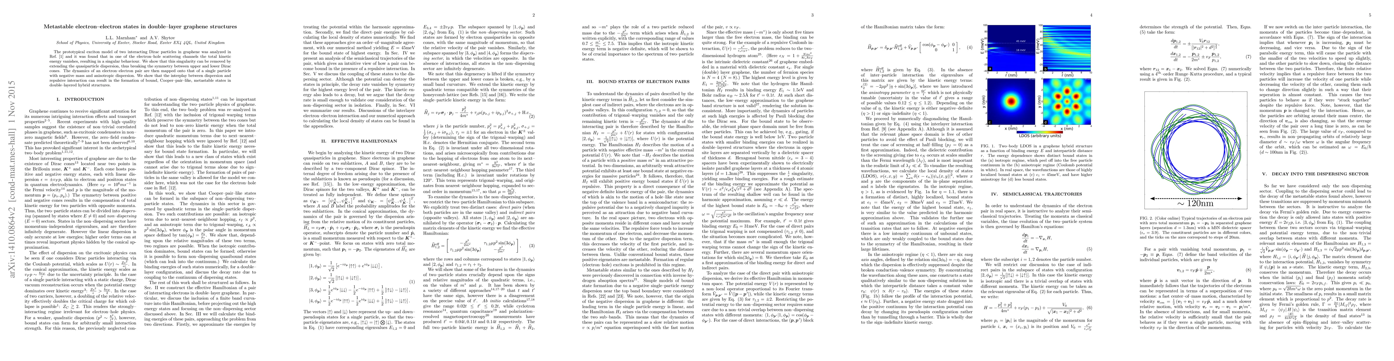The prototypical exciton model of two interacting Dirac particles in graphene was analyzed in [1] and it was found that in one of the electron-hole scattering channels the total kinetic energy vanishes, resulting in a singular behaviour. We show that this singularity can be removed by extending the quasiparticle dispersion, thus breaking the symmetry between upper and lower Dirac cones. The dynamics of an electron-electron pair are then mapped onto that of a single particle with negative mass and anisotropic dispersion. We show that the interplay between dispersion and repulsive interaction can result in the formation of bound, Cooper-pair-like, metastable states in double-layered hybrid structures.