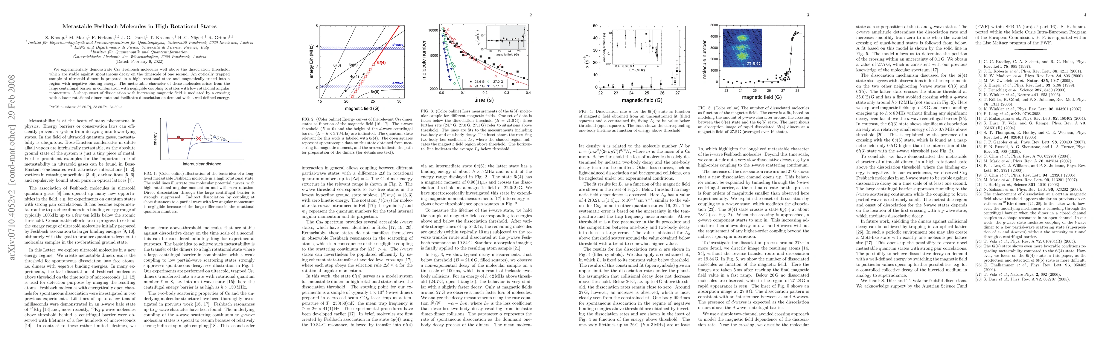 This paper demonstrates the creation of metastable Cs2 Feshbach molecules in high rotational states above the dissociation threshold, stable for one second due to a large centrifugal barrier. The dissociation is triggered sharply by a magnetic field crossing with a g-wave dimer state, allowing controlled dissociation at a defined energy.