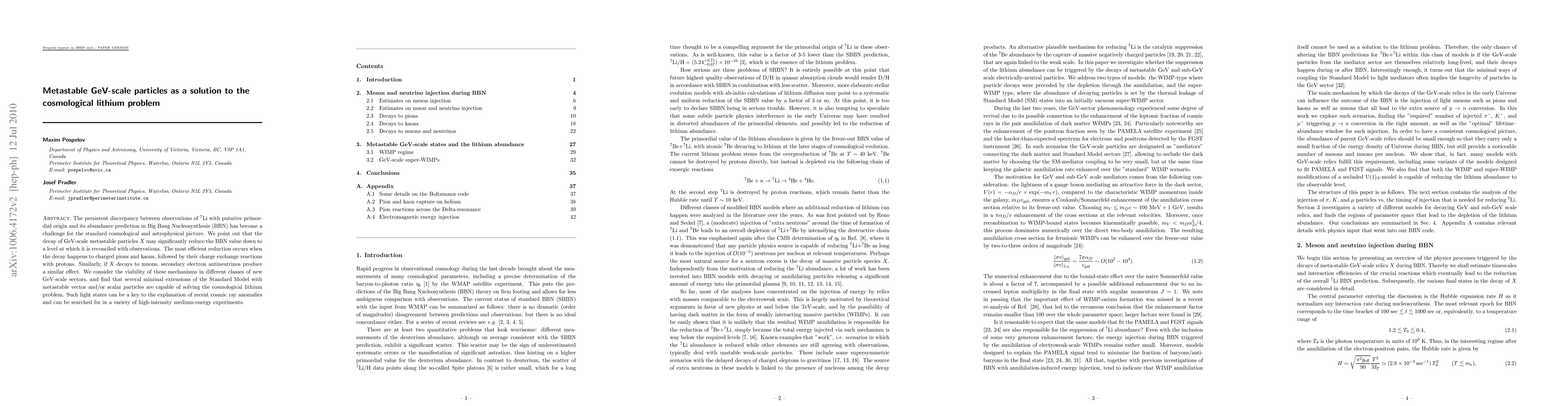 The paper proposes that decaying GeV-scale metastable particles could resolve the cosmological lithium problem by lowering the predicted 7Li abundance in Big Bang Nucleosynthesis (BBN) to match observed values. This solution is viable in minimal Standard Model extensions with light, vector or scalar particles, which could also explain recent cosmic ray anomalies. These light states can be detected in various high-intensity medium-energy experiments.