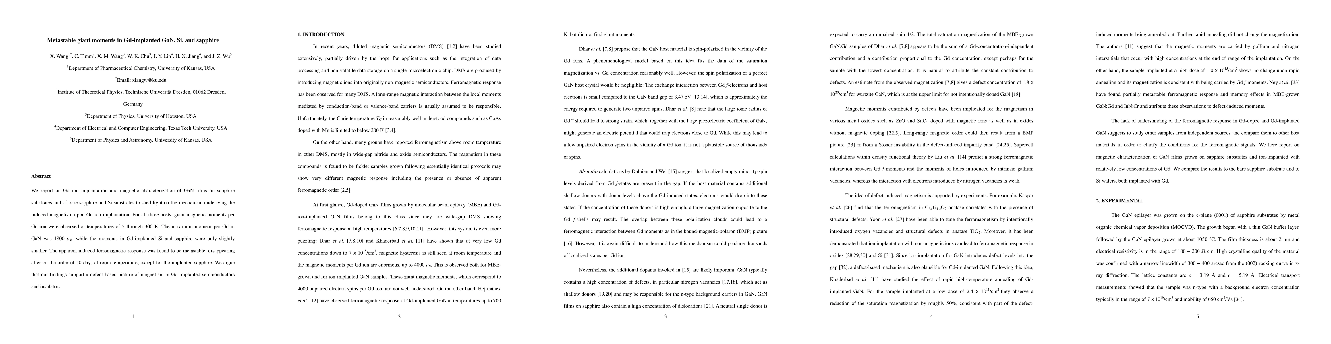 This study investigates Gd ion implantation in GaN, Si, and sapphire, revealing giant magnetic moments per Gd ion across a range of temperatures. The induced magnetism is metastable, fading within 50 days at room temperature, except for sapphire, supporting a defect-based mechanism for the observed magnetism.