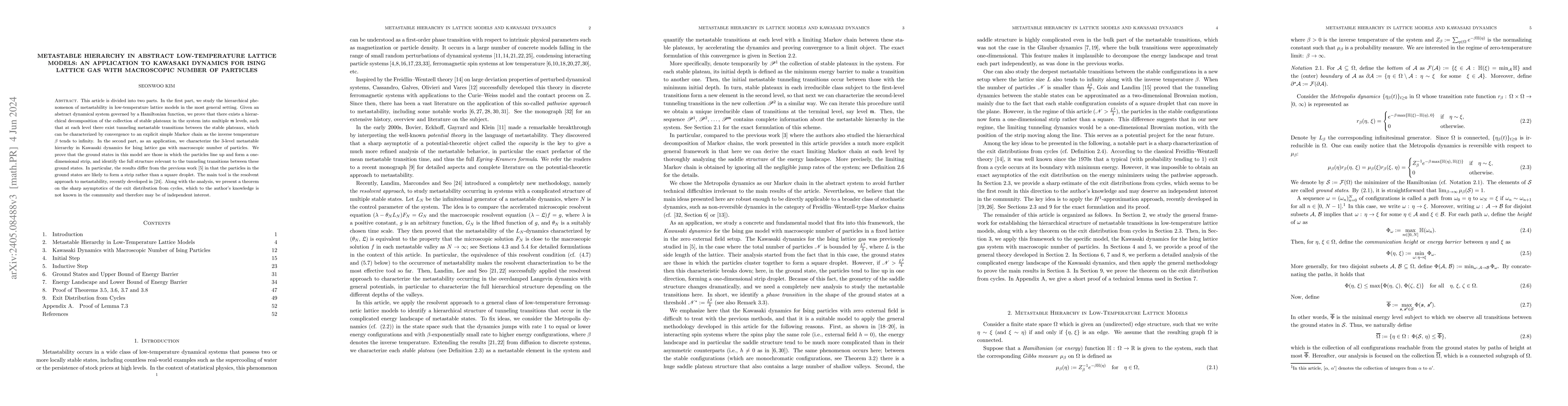 This paper studies metastability hierarchies in low-temperature lattice models, proving a multi-level decomposition of stable plateaux and their tunneling transitions. It applies this to Kawasaki dynamics for Ising lattice gas, revealing a strip-like ground state configuration rather than square droplets, and presents a novel theorem on exit distribution from cycles.