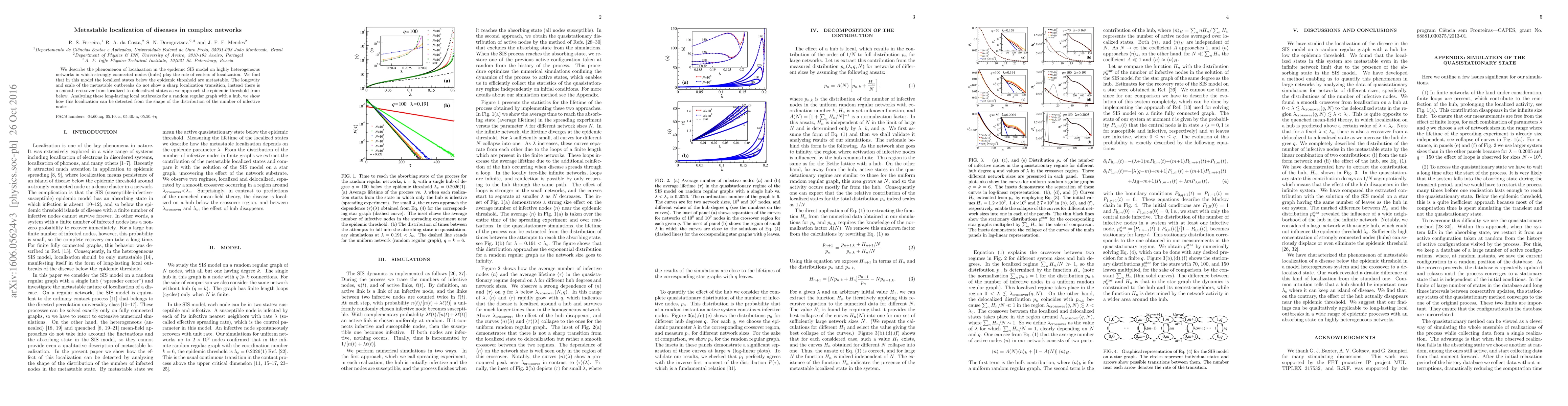 We describe the phenomenon of localization in the epidemic SIS model on highly heterogeneous networks in which strongly connected nodes (hubs) play the role of centers of localization. We find that in this model the localized states below the epidemic threshold are metastable. The longevity and scale of the metastable outbreaks do not show a sharp localization transition, instead there is a smooth crossover from localized to delocalized states as we approach the epidemic threshold from below. Analyzing these long-lasting local outbreaks for a random regular graph with a hub, we show how this localization can be detected from the shape of the distribution of the number of infective nodes.