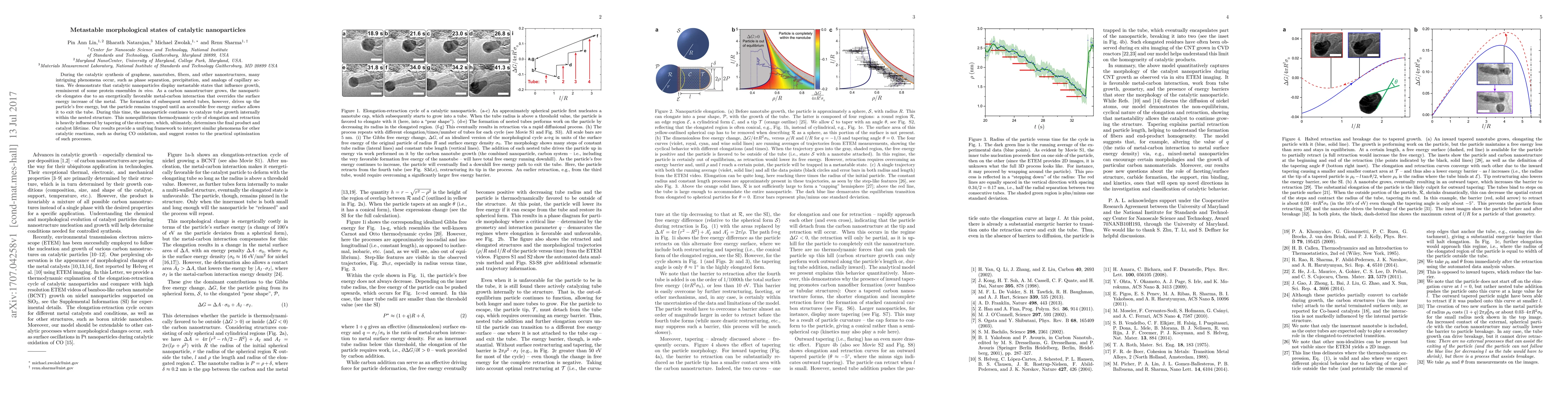 During the catalytic synthesis of graphene, nanotubes, fibers, and other nanostructures, many intriguing phenomena occur, such as phase separation, precipitation, and analogs of capillary action. We demonstrate that catalytic nanoparticles display metastable states that influence growth, reminiscent of some protein ensembles in vivo. As a carbon nanostructure grows, the nanoparticle elongates due to an energetically favorable metal-carbon interaction that overrides the surface energy increase of the metal. The formation of subsequent nested tubes, however, drives up the particle's free energy, but the particle remains trapped until an accessible free energy surface allows it to exit the tube. During this time, the nanoparticle continues to catalyze tube growth internally within the nested structure. This nonequilibrium thermodynamic cycle of elongation and retraction is heavily influenced by tapering of the structure, which, ultimately, determines the final product and catalyst lifetime. Our results provide a unifying framework to interpret similar phenomena for other catalytic reactions, such as during CO oxidation, and suggest routes to the practical optimization of such processes.