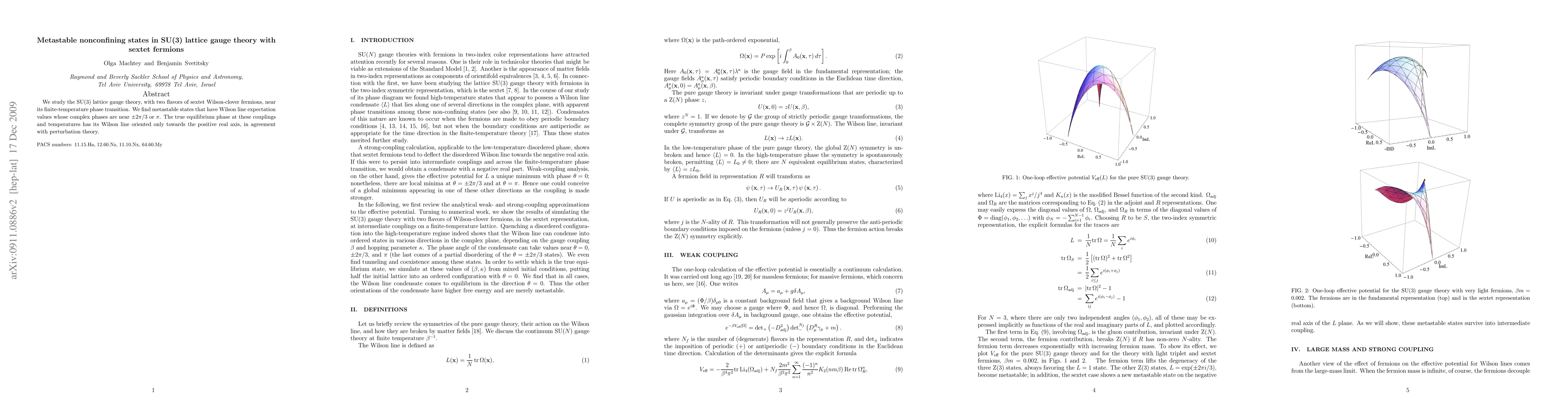We study the SU(3) lattice gauge theory, with two flavors of sextet Wilson-clover fermions, near its finite-temperature phase transition. We find metastable states that have Wilson line expectation values whose complex phases are near 2pi/3 or pi. The true equilibrium phase at these couplings and temperatures has its Wilson line oriented only towards the positive real axis, in agreement with perturbation theory.