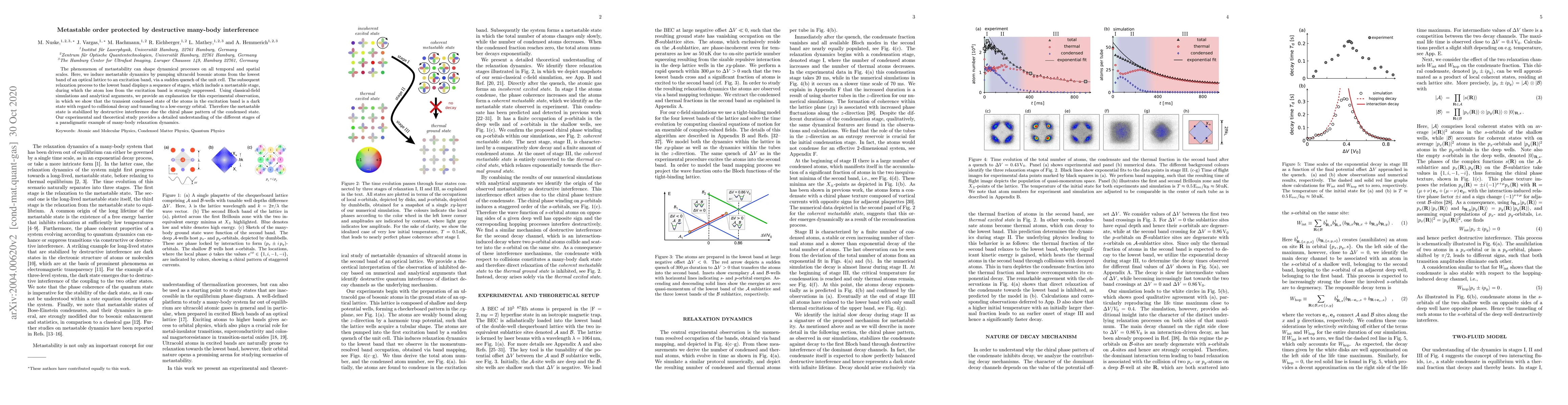 The phenomenon of metastability can shape dynamical processes on all temporal and spatial scales. Here, we induce metastable dynamics by pumping ultracold bosonic atoms from the lowest band of an optical lattice to an excitation band, via a sudden quench of the unit cell. The subsequent relaxation process to the lowest band displays a sequence of stages, which include a metastable stage, during which the atom loss from the excitation band is strongly suppressed. Using classical-field simulations and analytical arguments, we provide an explanation for this experimental observation, in which we show that the transient condensed state of the atoms in the excitation band is a dark state with regard to collisional decay and tunneling to a low-energy orbital. Therefore the metastable state is stabilized by destructive interference due to the chiral phase pattern of the condensed state. Our experimental and theoretical study provides a detailed understanding of the different stages of a paradigmatic example of many-body relaxation dynamics.
