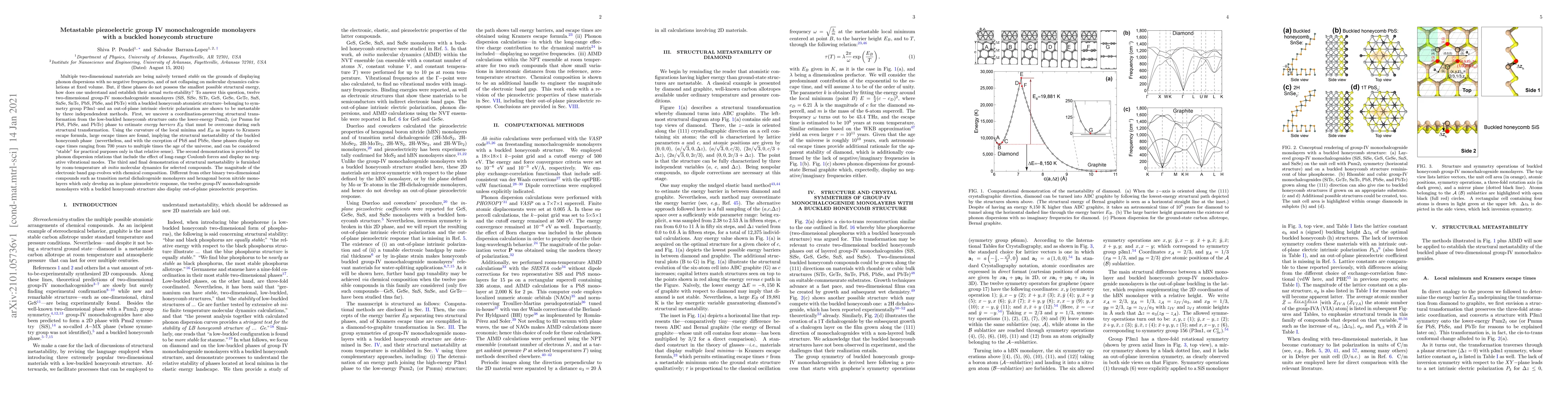 This paper investigates the metastability and piezoelectric properties of twelve group-IV monochalcogenide monolayers (SiS, SiSe, SiTe, GeS, GeSe, GeTe, SnS, SnSe, SnTe, PbS, PbSe, and PbTe) with a buckled honeycomb structure. The authors demonstrate their metastability using three methods, showing long escape times, stable phonon dispersion relations, and no negative vibrational modes, and highlight their unique out-of-plane piezoelectric response.