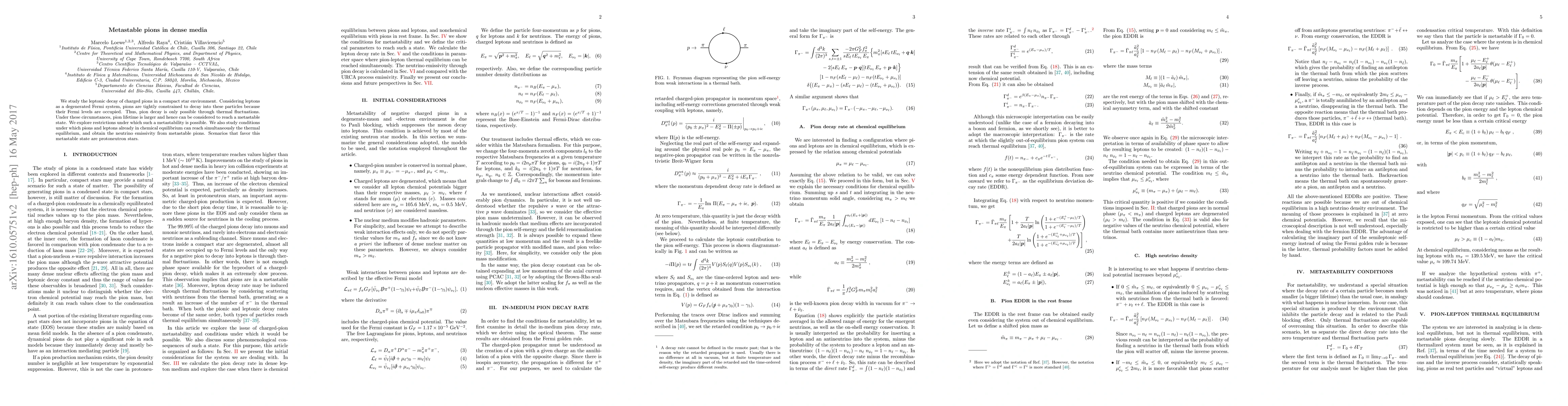 We study the leptonic decay of charged pions in a compact star environment. Considering leptons as a degenerated Fermi system, pions are tightly constrained to decay into these particles because their Fermi levels are occupied. Thus, pion decay is only possible through thermal fluctuations. Under these circumstances, pion lifetime is larger and hence can be considered to reach a metastable state. We explore restrictions under which such a metastability is possible. We also study conditions under which pions and leptons already in chemical equilibrium can reach simultaneously the thermal equilibrium, and obtain the neutrino emissivity from metastable pions. Scenarios that favor this metastable state are protoneutron stars.