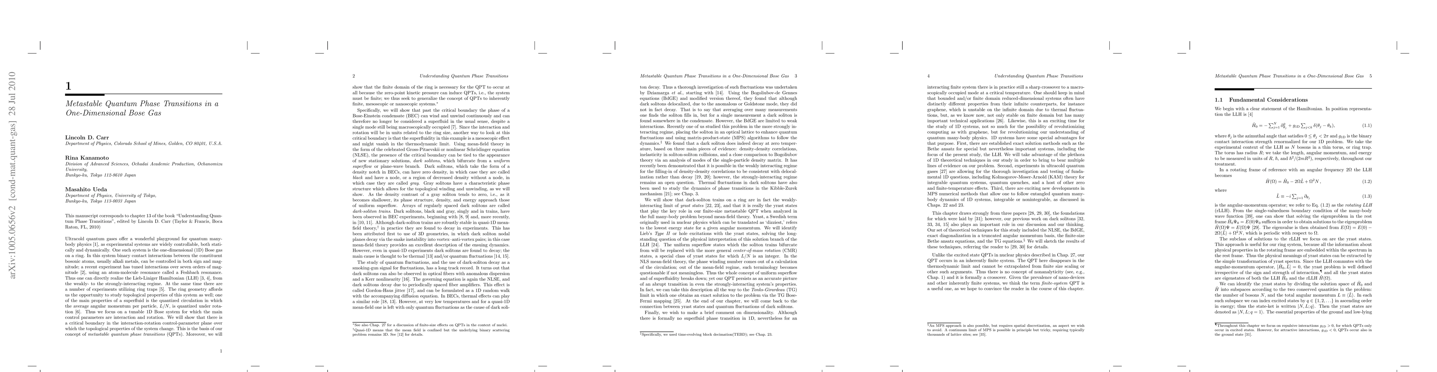 This is a chapter for a book. The first paragraph of this chapter is as follows: "Ultracold quantum gases offer a wonderful playground for quantum many body physics, as experimental systems are widely controllable, both statically and dynamically. One such system is the one-dimensional (1D) Bose gas on a ring. In this system binary contact interactions between the constituent bosonic atoms, usually alkali metals, can be controlled in both sign and magnitude; a recent experiment has tuned interactions over seven orders of magnitude, using an atom-molecule resonance called a Feshbach resonance. Thus one can directly realize the Lieb-Liniger Hamiltonian, from the weakly- to the strongly-interacting regime. At the same time there are a number of experiments utilizing ring traps. The ring geometry affords us the opportunity to study topological properties of this system as well; one of the main properties of a superfluid is the quantized circulation in which the average angular momentum per particle, L/N, is quantized under rotation. Thus we focus on a tunable 1D Bose system for which the main control parameters are interaction and rotation. We will show that there is a critical boundary in the interaction-rotation control-parameter plane over which the topological properties of the system change. This is the basis of our concept of \textit{metastable quantum phase transitions} (QPTs). Moreover, we will show that the finite domain of the ring is necessary for the QPT to occur at all because the zero-point kinetic pressure can induce QPTs, i.e., the system must be finite; we thus seek to generalize the concept of QPTs to inherently finite, mesoscopic or nanoscopic systems."