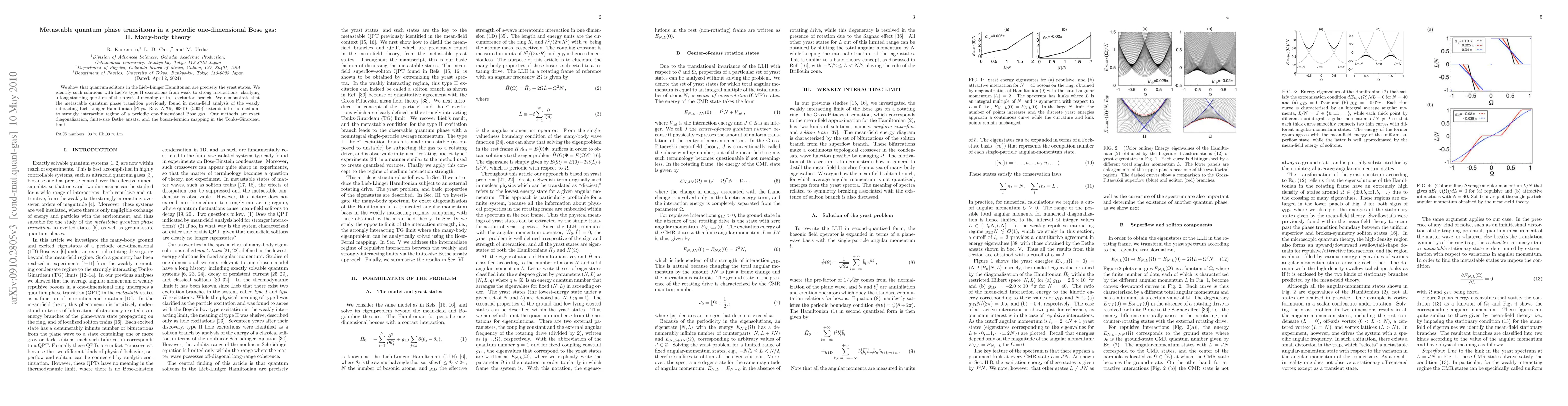 We show that quantum solitons in the Lieb-Liniger Hamiltonian are precisely the yrast states. We identify such solutions clearly with Lieb's type II excitations from weak to strong interactions, clarifying a long-standing question of the physical meaning of this excitation branch. We demonstrate that the metastable quantum phase transition previously found in mean field analysis of the weakly-interacting Lieb-Liniger Hamiltonian [Phys. Rev. A {\bf 79}, 063616 (2009)] extends into the medium- to strongly-interacting regime of a periodic one-dimensional Bose gas. Our methods are exact diagonalization, finite-size Bethe ansatz, and the boson-fermion mapping in the Tonks-Girardeau limit.