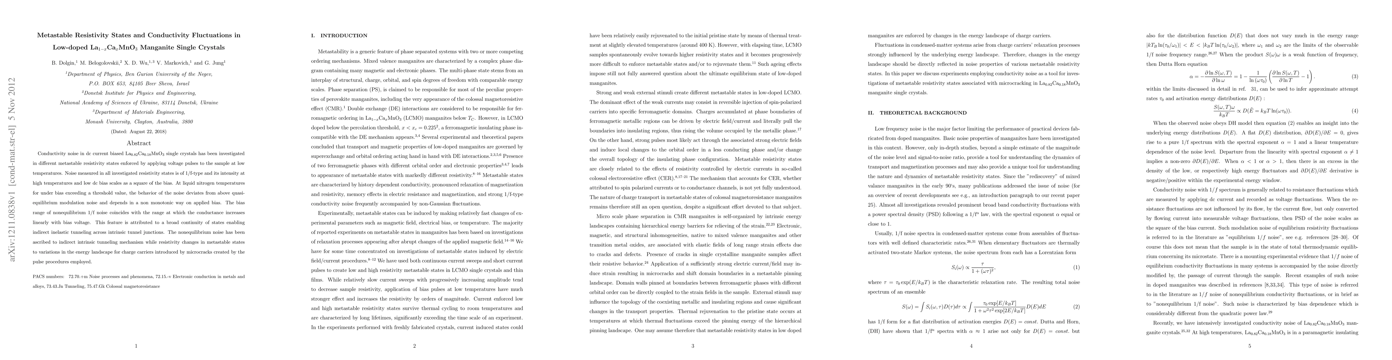 Conductivity noise in dc current biased La_{0.82}Ca_{0.18}MnO_{3} single crystals has been investigated in different metastable resistivity states enforced by applying voltage pulses to the sample at low temperatures. Noise measured in all investigated resistivity states is of 1/f-type and its intensity at high temperatures and low dc bias scales as a square of the bias. At liquid nitrogen temperatures for under bias exceeding a threshold value, the behavior of the noise deviates from above quasi- equilibrium modulation noise and depends in a non monotonic way on applied bias. The bias range of nonequilibrium 1/f noise coincides with the range at which the conductance increases linearly with bias voltage. This feature is attributed to a broad continuity of states enabling indirect inelastic tunneling across intrinsic tunnel junctions. The nonequilibrium noise has been ascribed to indirect intrinsic tunneling mechanism while resistivity changes in metastable states to variations in the energy landscape for charge carriers introduced by microcracks created by the pulse procedures employed