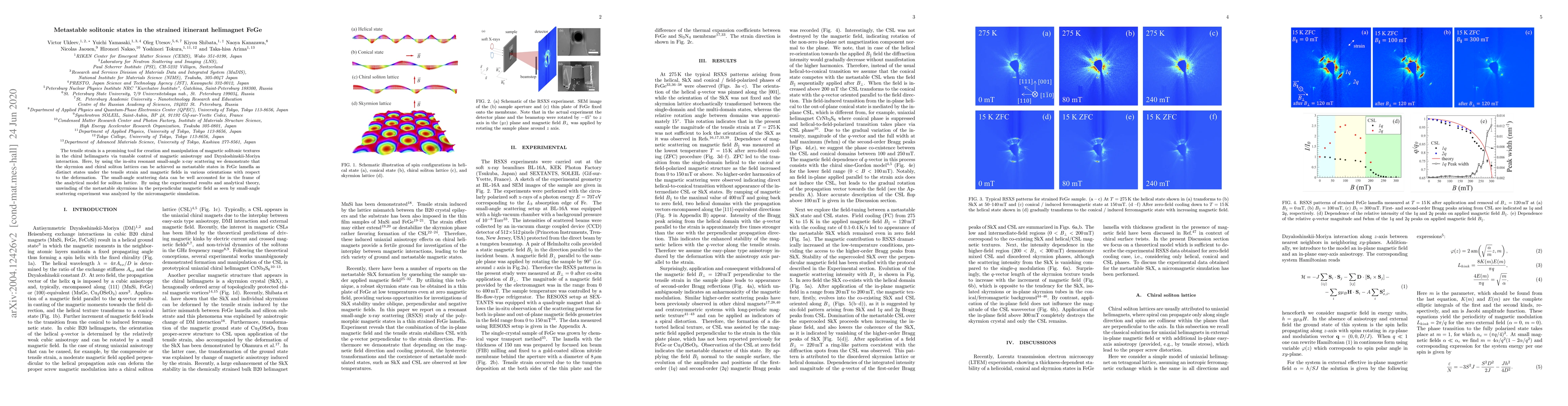 The tensile strain is a promising tool for creation and manipulation of magnetic solitonic textures in the chiral helimagnets via tunable control of magnetic anisotropy and Dzyaloshinskii-Moriya interaction. Here, by using the in-situ resonant small-angle x-ray scattering we demonstrate that the skyrmion and chiral soliton lattices can be achieved as metastable states in FeGe lamella as distinct states or even simultaneously by combining the tensile strain and magnetic fields in various orientations with respect to the deformation. The small-angle scattering data are discussed in the frame of the analytical model which is sufficient to describe the experimental results for soliton lattice. By using the experimental results and analytical theory, unwinding of the metastable skyrmions in the perpendicular magnetic field as seen by small-angle scattering experiment was analyzed by the micromagnetic simulation.