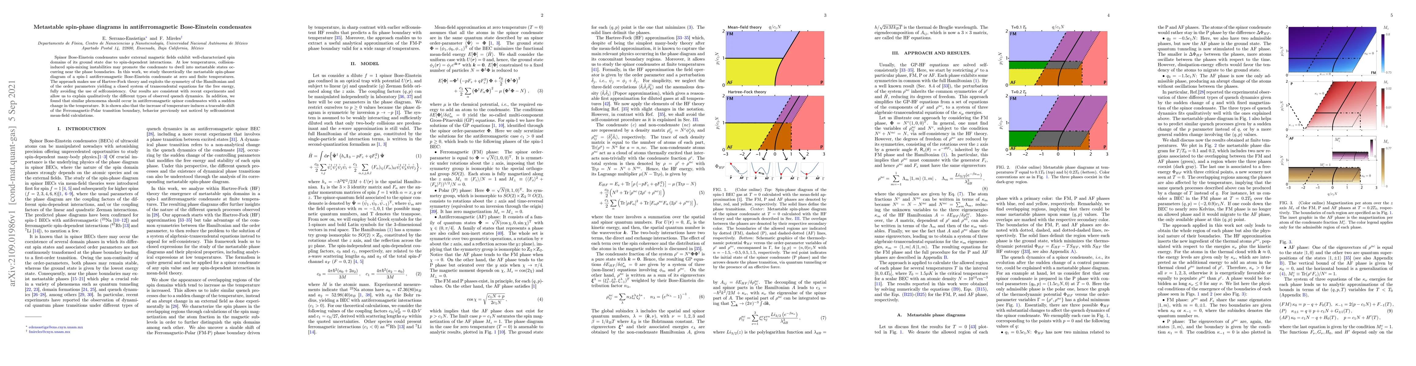 Spinor Bose-Einstein condensates under external magnetic fields exhibit well-characterized spin domains of its ground state due to spin-dependent interactions. At low temperatures, collision-induced spin-mixing instabilities may promote the condensate to dwell into metastable states occurring near the phase boundaries. In this work, we study theoretically the metastable spin-phase diagram of a spin-1 antiferromagnetic Bose-Einstein condensate at zero and finite temperatures. The approach makes use of Hartree-Fock theory and exploits the symmetry of the Hamiltonian and of the order parameters yielding a closed system of transcendental equations for the free energy, fully avoiding the use of selfconsistency. Our results are consistent with recent experiments and allow us to explain qualitatively the different types of observed quench dynamics. In addition, we found that similar phenomena should occur in antiferromagnetic spinor condensates with a sudden change in the temperature. It is shown also that the increase of temperature induces a traceable shift of the Ferromagnetic-Polar transition boundary, behavior previously not noticed by selfconsistent mean-field calculations.