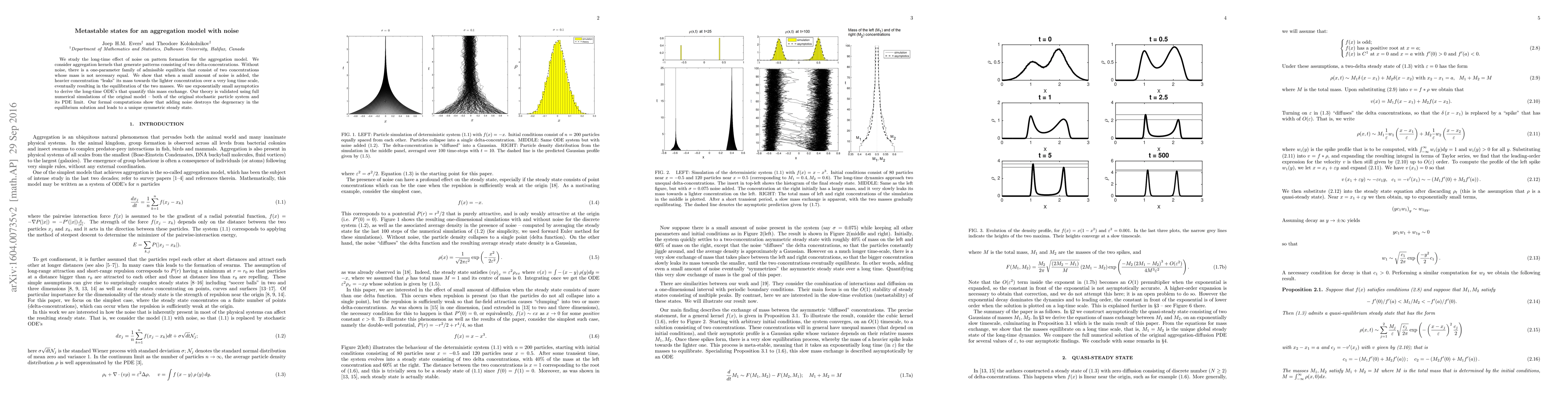 We study the long-time effect of noise on pattern formation for the aggregation model. We consider aggregation kernels that generate patterns consisting of two delta-concentrations. Without noise, there is a one-parameter family of admissible equilibria that consist of two concentrations whose mass is not necessary equal. We show that when a small amount of noise is added, the heavier concentration "leaks" its mass towards the lighter concentration over a very long time scale, eventually resulting in the equilibration of the two masses. We use exponentially small asymptotics to derive the long-time ODE's that quantify this mass exchange. Our theory is validated using full numerical simulations of the original model -- both of the original stochastic particle system and its PDE limit. Our formal computations show that adding noise destroys the degeneracy in the equilibrium solution and leads to a unique symmetric steady state.
