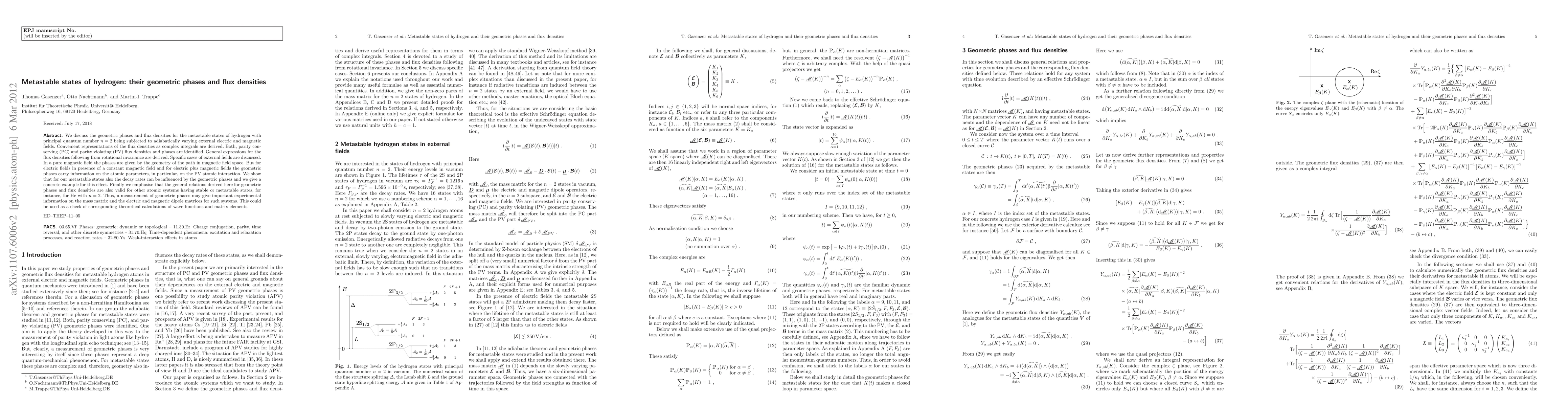 This paper investigates the geometric phases and flux densities in metastable hydrogen states (n=2) under adiabatic external electric and magnetic fields, deriving expressions for both parity conserving and violating phases. It highlights the influence of these phases on decay rates and suggests that measurements could provide insights into atomic interaction parameters.
