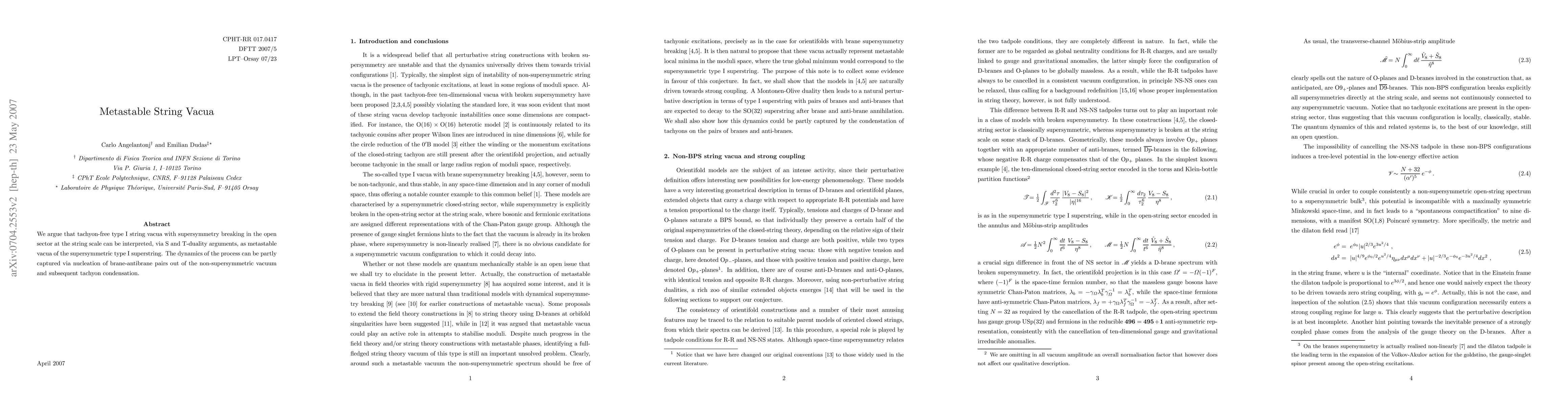 This paper suggests that tachyon-free type I string vacua with open sector supersymmetry breaking at the string scale can be viewed as metastable states of supersymmetric type I superstring theory, facilitated by S and T-duality, and the dynamics involve brane-antibrane pair nucleation and tachyon condensation.