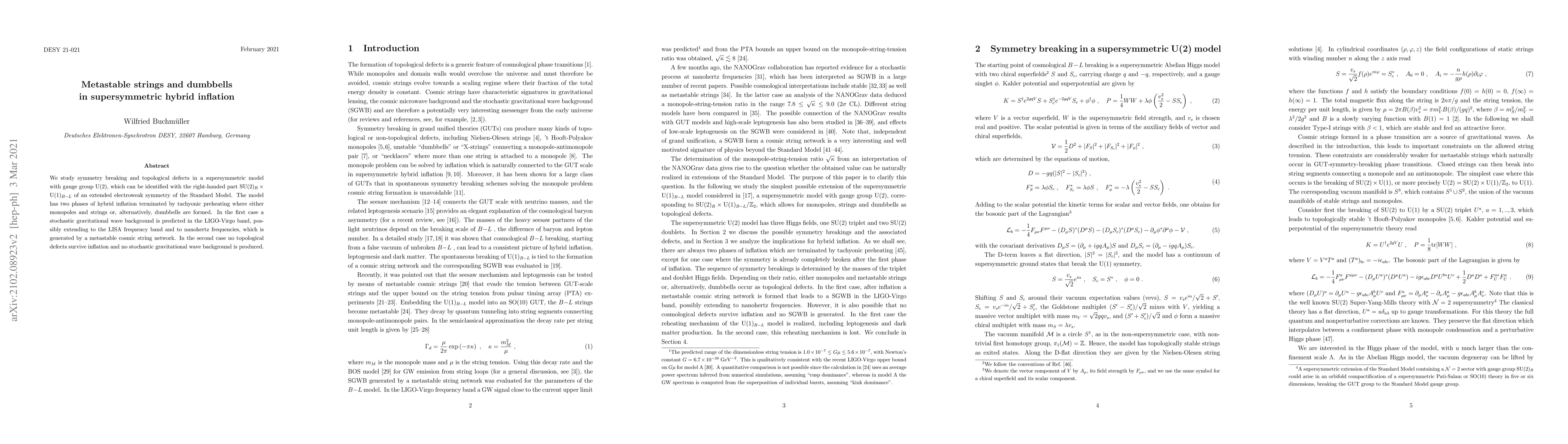 We study symmetry breaking and topological defects in a supersymmetric model with gauge group $\text{U}(2)$, which can be identified with the right-handed part $\text{SU}(2)_R \times \text{U}(1)_{B-L}$ of an extended electroweak symmetry of the Standard Model. The model has two phases of hybrid inflation terminated by tachyonic preheating where either monopoles and strings or, alternatively, dumbbells are formed. In the first case a stochastic gravitational wave background is predicted in the LIGO-Virgo band, possibly extending to the LISA frequency band and to nanohertz frequencies, which is generated by a metastable cosmic string network. In the second case no topological defects survive inflation and no stochastic gravitational wave background is produced.