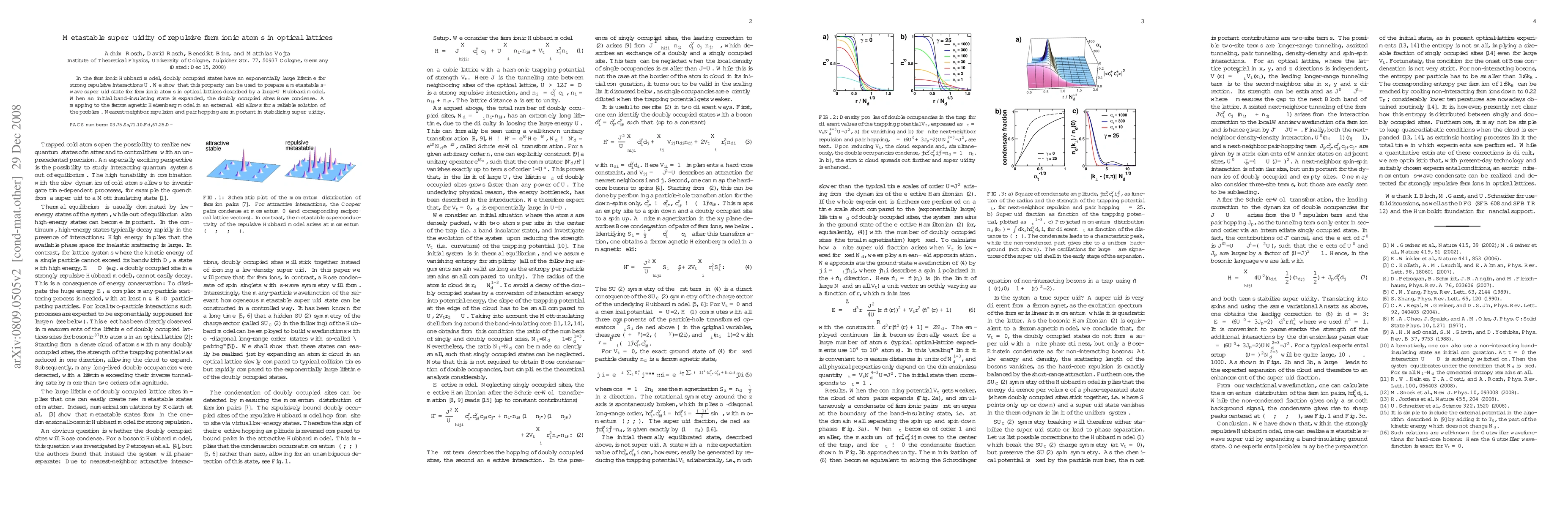 This paper demonstrates the preparation of a metastable s-wave superfluid state in optical lattices using repulsive fermionic atoms, leveraging the long lifetime of doubly occupied states in the fermionic Hubbard model. The study employs a mapping to the ferromagnetic Heisenberg model to reliably solve the problem, highlighting the role of nearest-neighbor repulsion and pair hopping in stabilizing superfluidity.