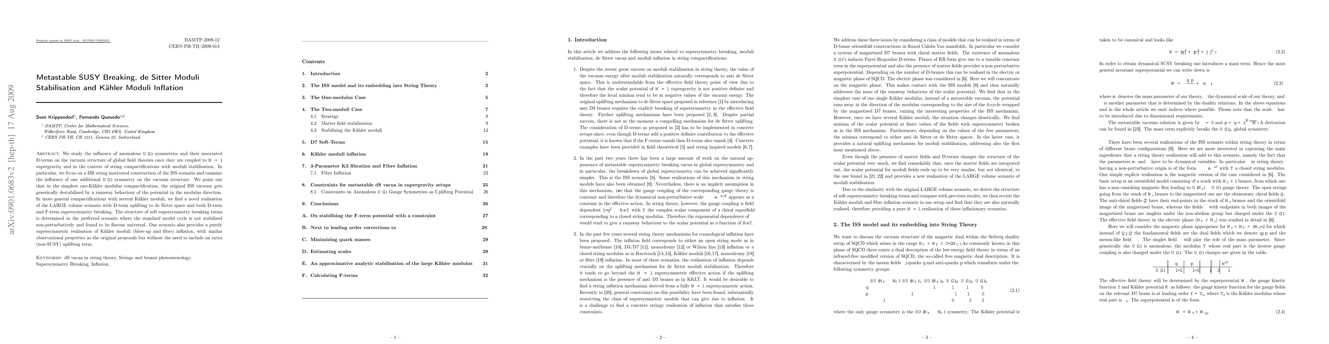 This paper explores the impact of anomalous U(1) symmetries on vacuum structures in N=1 supergravity, particularly in string compactifications with moduli stabilisation. It finds that a single Kähler modulus compactification destabilizes the ISS vacuum, while multi-Kähler modulus scenarios enable D-term uplifting to de Sitter space, resulting in a supersymmetric realization of Kähler moduli inflation.