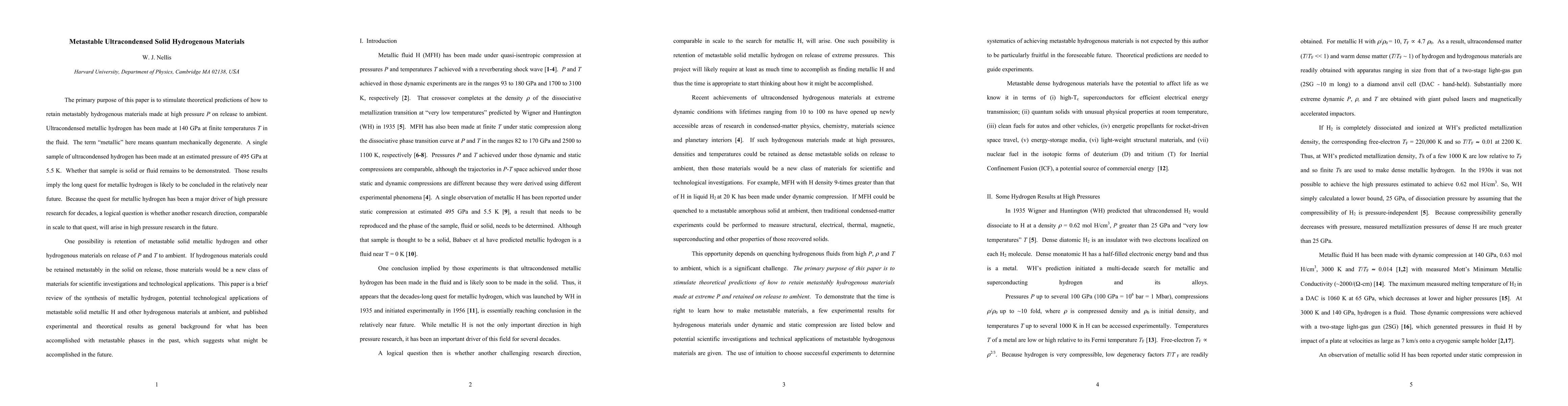 This paper explores the theoretical predictions for retaining metastable ultracondensed solid hydrogenous materials at ambient conditions after high-pressure synthesis. It reviews the synthesis of metallic hydrogen and potential technological applications of metastable solid metallic hydrogen, suggesting a new research direction in high-pressure physics.