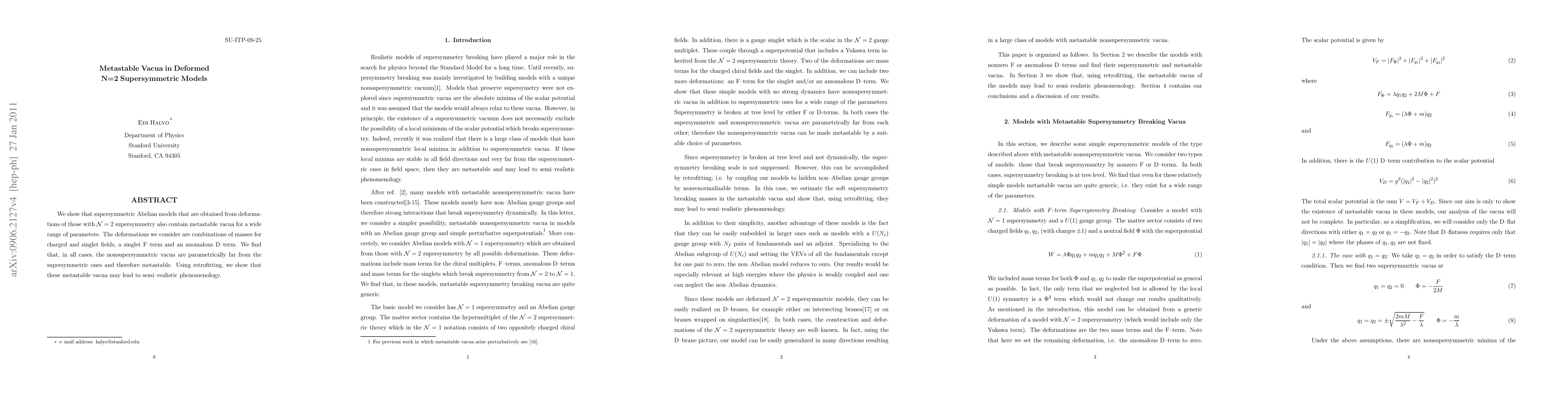 This research demonstrates that deformed N=2 supersymmetric Abelian models possess metastable vacua over a broad parameter range, resulting from combinations of masses and F- and D-terms. These nonsupersymmetric vacua remain far from supersymmetric states, thus being metastable, and can potentially lead to semi-realistic phenomenology through retrofitting.