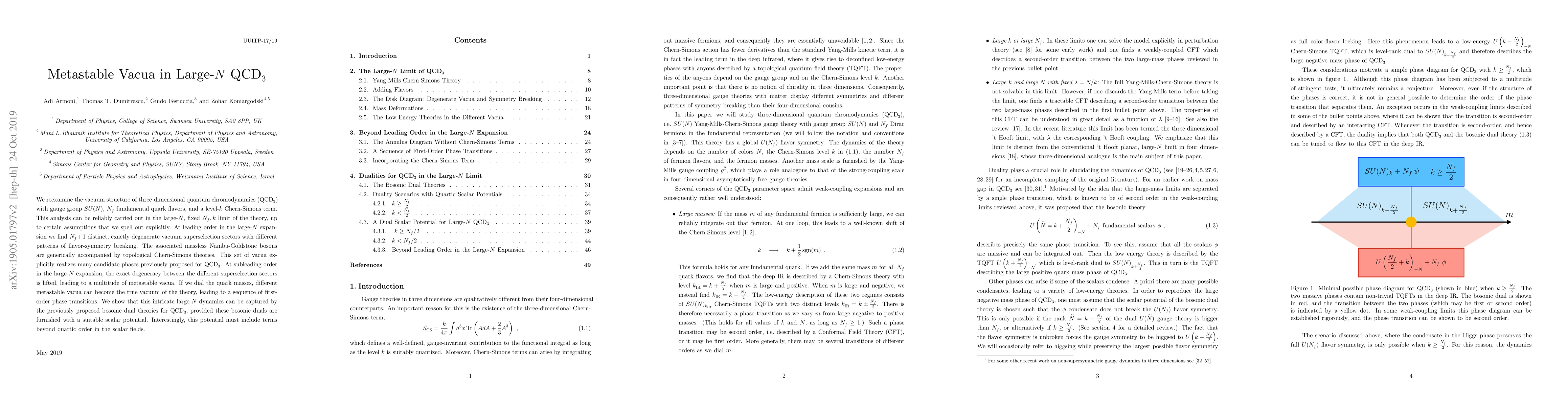 We reexamine the vacuum structure of three-dimensional quantum chromodynamics (QCD$_3$) with gauge group $SU(N)$, $N_f$ fundamental quark flavors, and a level-$k$ Chern-Simons term. This analysis can be reliably carried out in the large-$N$, fixed $N_f, k$ limit of the theory, up to certain assumptions that we spell out explicitly. At leading order in the large-$N$ expansion we find $N_f + 1$ distinct, exactly degenerate vacuum superselection sectors with different patterns of flavor-symmetry breaking. The associated massless Nambu-Goldstone bosons are generically accompanied by topological Chern-Simons theories. This set of vacua contains many candidate phases previously proposed for QCD$_3$. At subleading order in the large-$N$ expansion, the exact degeneracy between the different superselection sectors is lifted, leading to a multitude of metastable vacua. If we dial the quark masses, different metastable vacua can become the true vacuum of the theory, leading to a sequence of first-order phase transitions. This intricate large-$N$ dynamics can be captured by the previously proposed bosonic dual theories for QCD$_3$, provided these bosonic duals are furnished with a suitable scalar potential. Interestingly, this potential must include terms beyond quartic order in the scalar fields.