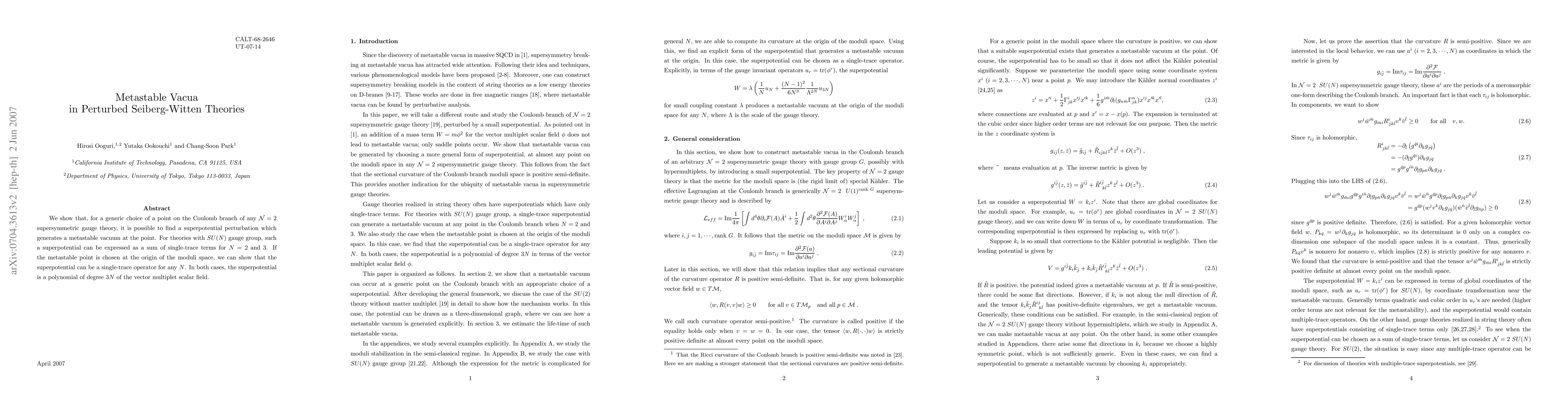 We show that, for a generic choice of a point on the Coulomb branch of any N=2 supersymmetric gauge theory, it is possible to find a superpotential perturbation which generates a metastable vacuum at the point. For theories with SU(N) gauge group, such a superpotential can be expressed as a sum of single-trace terms for N=2 and 3. If the metastable point is chosen at the origin of the moduli space, we can show that the superpotential can be a single-trace operator for any N. In both cases, the superpotential is a polynomial of degree 3N of the vector multiplet scalar field.