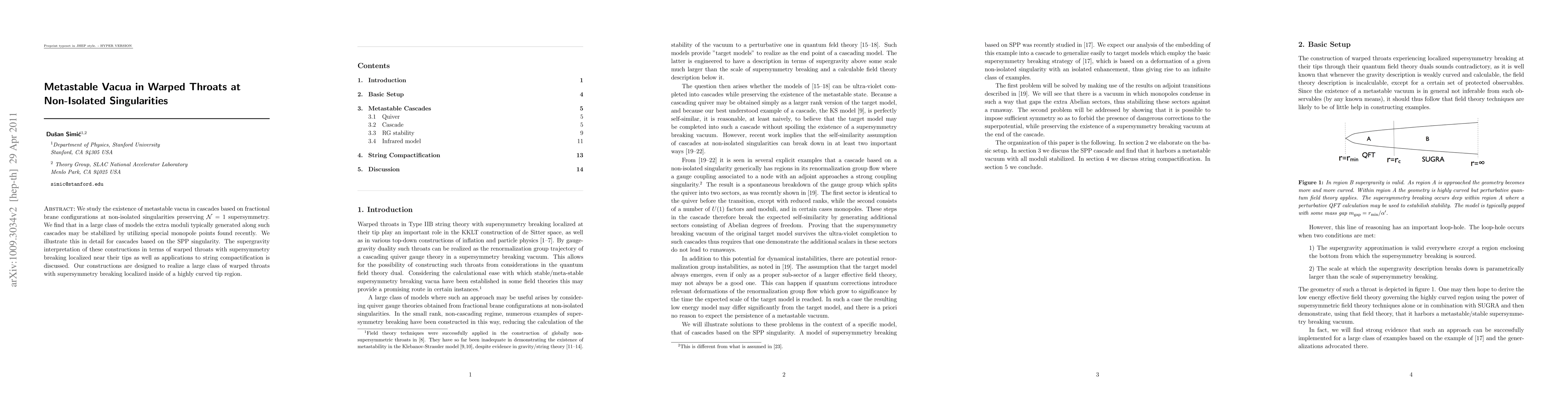 This research explores metastable vacua in cascades based on fractional brane configurations at non-isolated singularities, demonstrating that extra moduli can be stabilized using special monopole points. The study details the supergravity interpretation of these constructions in warped throats, with supersymmetry breaking localized near their tips, and discusses applications to string compactification.
