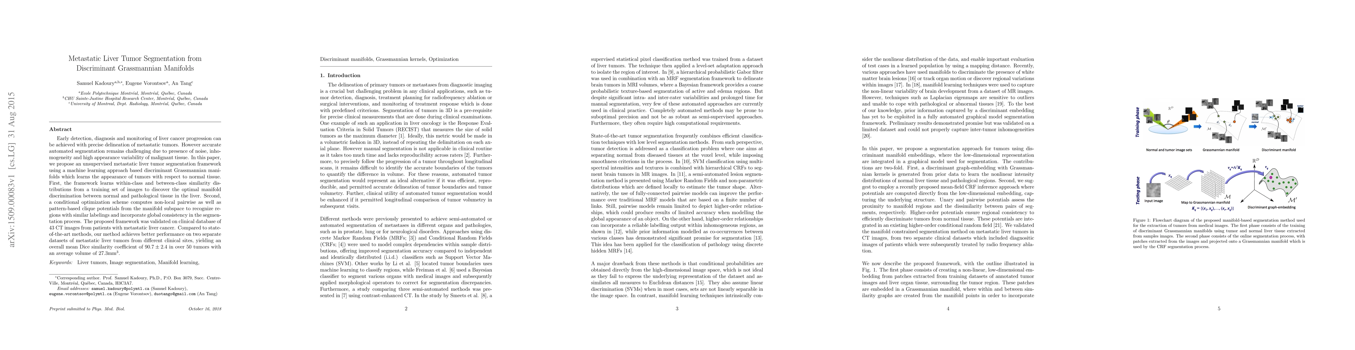 The early detection, diagnosis and monitoring of liver cancer progression can be achieved with the precise delineation of metastatic tumours. However, accurate automated segmentation remains challenging due to the presence of noise, inhomogeneity and the high appearance variability of malignant tissue. In this paper, we propose an unsupervised metastatic liver tumour segmentation framework using a machine learning approach based on discriminant Grassmannian manifolds which learns the appearance of tumours with respect to normal tissue. First, the framework learns within-class and between-class similarity distributions from a training set of images to discover the optimal manifold discrimination between normal and pathological tissue in the liver. Second, a conditional optimisation scheme computes nonlocal pairwise as well as pattern-based clique potentials from the manifold subspace to recognise regions with similar labelings and to incorporate global consistency in the segmentation process. The proposed framework was validated on a clinical database of 43 CT images from patients with metastatic liver cancer. Compared to state-of-the-art methods, our method achieves a better performance on two separate datasets of metastatic liver tumours from different clinical sites, yielding an overall mean Dice similarity coefficient of 90.7 +/- 2.4 in over 50 tumours with an average volume of 27.3 mm3.