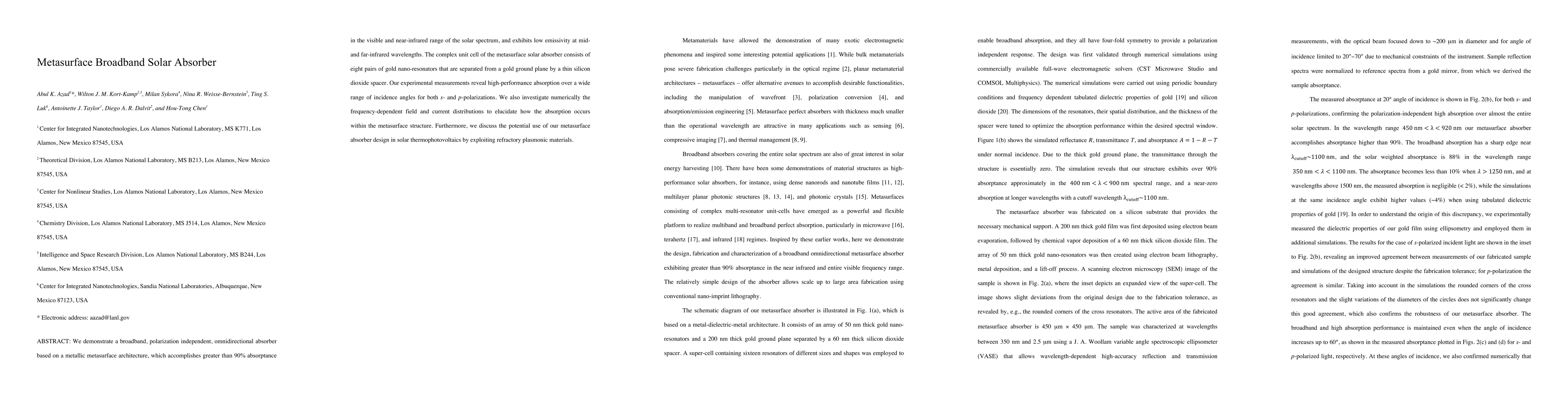 This research introduces a metasurface-based solar absorber with over 90% absorptance in the visible and near-infrared spectrum and low emissivity in mid- to far-infrared wavelengths. The design utilizes gold nano-resonators in a metallic metasurface architecture, achieving high-performance absorption across various angles and polarizations.