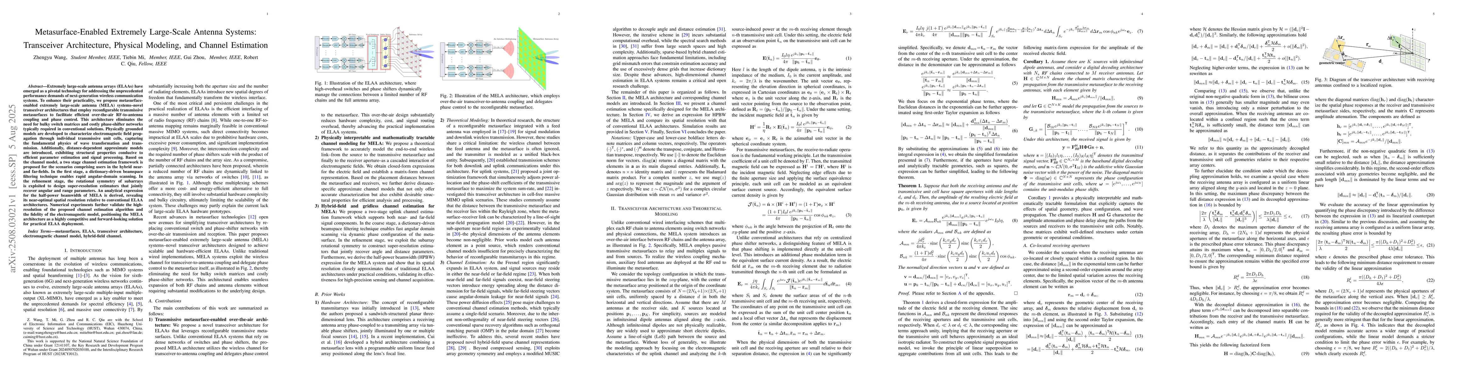 Extremely large-scale antenna arrays (ELAAs) have emerged as a pivotal technology for addressing the unprecedented performance demands of next-generation wireless communication systems. To enhance their practicality, we propose metasurface-enabled extremely large-scale antenna (MELA) systems -- novel transceiver architectures that employ reconfigurable transmissive metasurfaces to facilitate efficient over-the-air RF-to-antenna coupling and phase control. This architecture eliminates the need for bulky switch matrices and costly phase-shifter networks typically required in conventional solutions. Physically grounded models are developed to characterize electromagnetic field propagation through individual transmissive unit cells, capturing the fundamental physics of wave transformation and transmission. Additionally, distance-dependent approximate models are introduced, exhibiting structural properties conducive to efficient parameter estimation and signal processing. Based on the channel model, a two stage channel estimation framework is proposed for the scenarios comprising users in the hybrid near- and far-fields. In the first stage, a dictionary-driven beamspace filtering technique enables rapid angular-domain scanning. In the refinement stage, the rotational symmetry of subarrays is exploited to design super-resolution estimators that jointly recover angular and range parameters. An analytical expression for the half-power beamwidth of MELA is derived, revealing its near-optimal spatial resolution relative to conventional ELAA architectures. Numerical experiments further validate the high-resolution of the proposed channel estimation algorithm and the fidelity of the electromagnetic model, positioning the MELA architecture as a highly competitive and forward-looking solution for practical ELAA deployment.