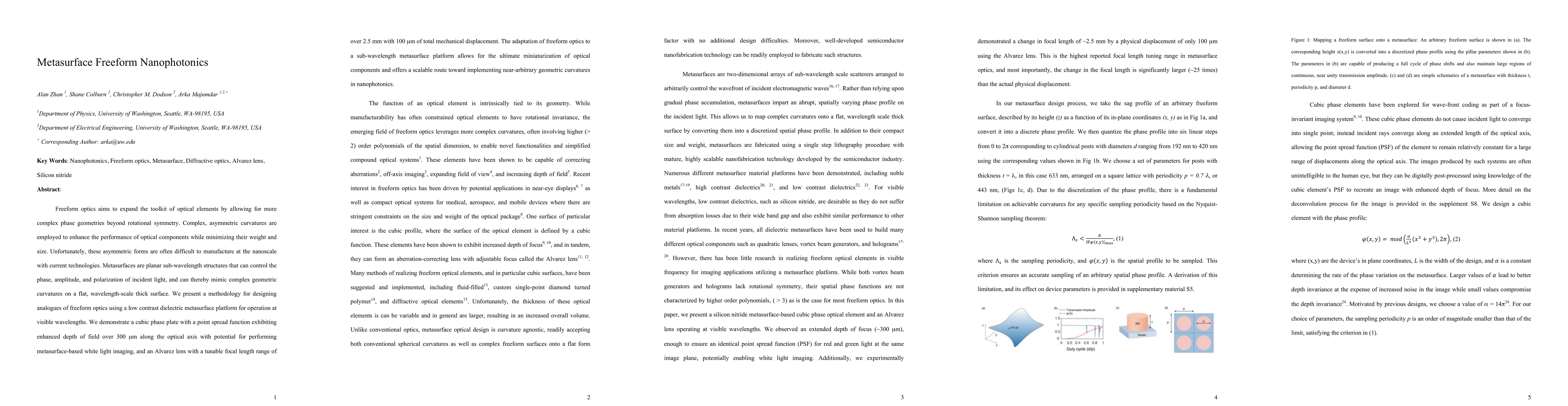 This paper proposes a methodology for designing low-contrast dielectric metasurfaces to mimic freeform optics, enabling complex phase geometries on a flat nanoscale surface. The authors demonstrate a cubic phase plate and an Alvarez lens, showcasing enhanced depth of field and tunable focal length, respectively, highlighting the potential for miniaturized and scalable optical components.