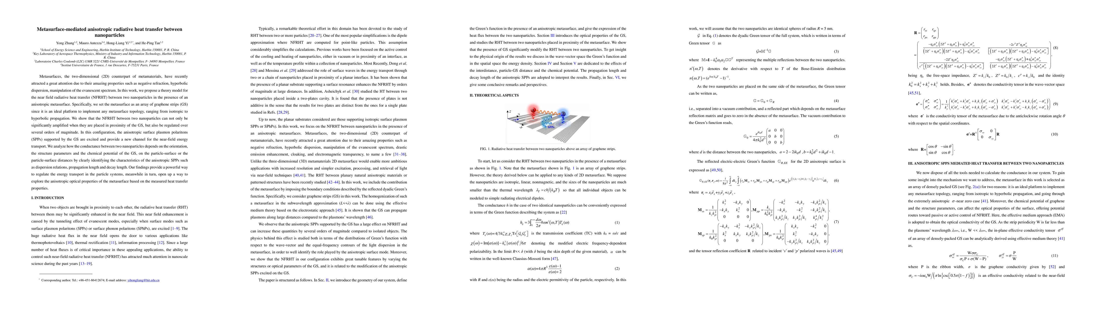 This paper proposes a theoretical model for anisotropic radiative heat transfer between nanoparticles mediated by an anisotropic metasurface composed of graphene strips. The study demonstrates significant amplification and regulation of near-field radiative heat transfer through the excitation of anisotropic surface plasmon polaritons, providing a new method for controlling energy transport in nanoparticle systems.