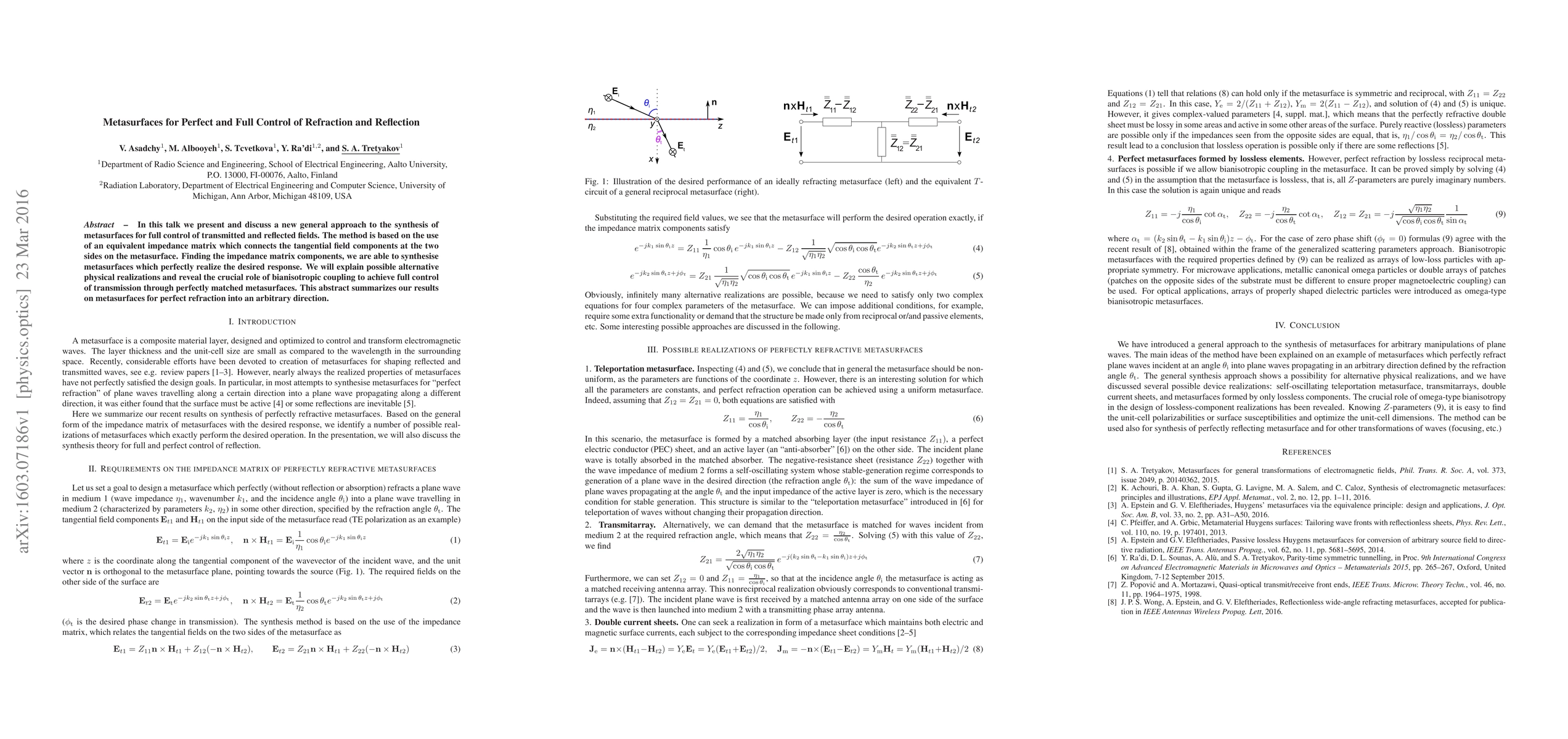 In this talk we present and discuss a new general approach to the synthesis of metasurfaces for full control of transmitted and reflected fields. The method is based on the use of an equivalent impedance matrix which connects the tangential field components at the two sides on the metasurface. Finding the impedance matrix components, we are able to synthesize metasurfaces which perfectly realize the desired response. We will explain possible alternative physical realizations and reveal the crucial role of bianisotropic coupling to achieve full control of transmission through perfectly matched metasurfaces. This abstract summarizes our results on metasurfaces for perfect refraction into an arbitrary direction.