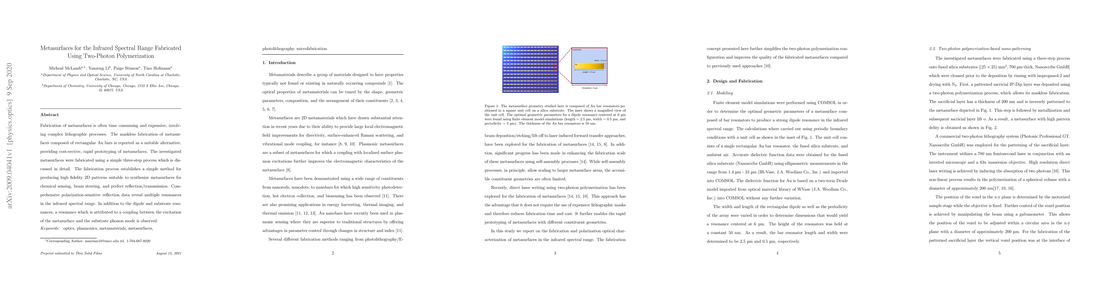 Fabrication of metasurfaces is ofthen time consuming and expensive, involving complex lithographic processes. The maskless fabrication of metasurfaces composed of rectangular Au bars is reported as a suitable alternative, providing cost-effective, rapid prototyping of metasurfaces. The investigated metasurfaces were fabricated using a simple three-step process which is discussed in detail. The fabrication process establishes a simple method for producing high fidelity 2D patterns suitable to synthesize metasurfaces for chemical sensing, beam steering, and perfect reflection/transmission. Comprehensive polarization-sensitive reflection data reveal multiple resonances in the infrared spectral range. In addition to the dipole and substrate resonances, a resonance which is attributed to a coupling between the excitation of the metasurface and the substrate phonon mode is observed.