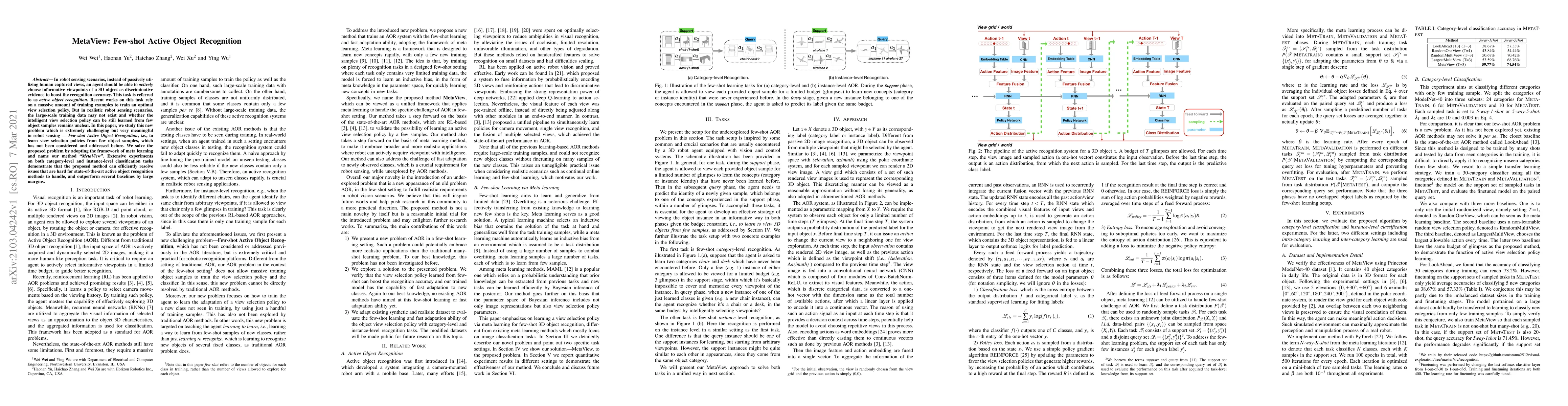 MetaView introduces a meta-learning framework for few-shot active object recognition, enabling robots to select informative viewpoints from limited object samples. The method demonstrates superior performance over baselines in both category-level and instance-level classification tasks.