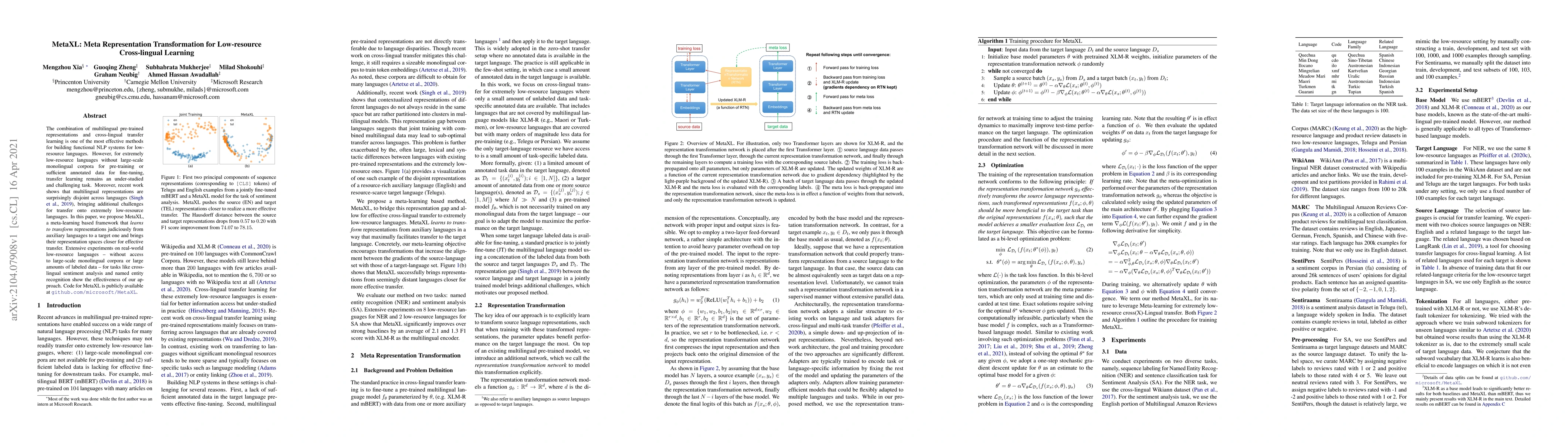 MetaXL proposes a meta-learning framework to transform multilingual representations for effective cross-lingual transfer learning in low-resource languages, addressing the challenge of disjoint representations across languages. Experiments demonstrate its effectiveness on tasks like cross-lingual sentiment analysis and named entity recognition.