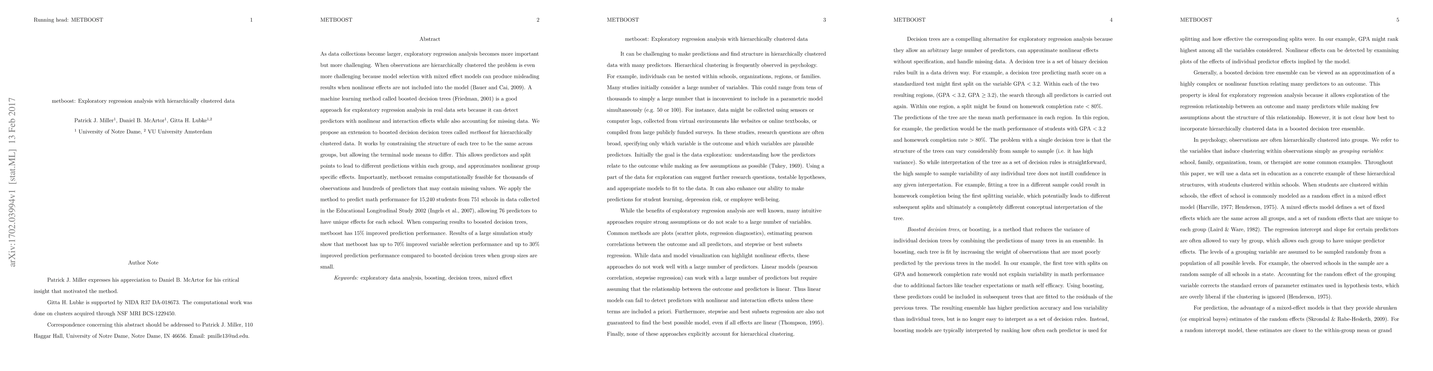 The paper proposes metboost, an extension of boosted decision trees for exploratory regression analysis with hierarchically clustered data, which constrains tree structure across groups but allows for group-specific terminal node means to detect nonlinear effects. Metboost improves prediction and variable selection performance by up to 70% and 30% respectively compared to standard boosted decision trees, as demonstrated through an application to student math performance data and a large simulation study.