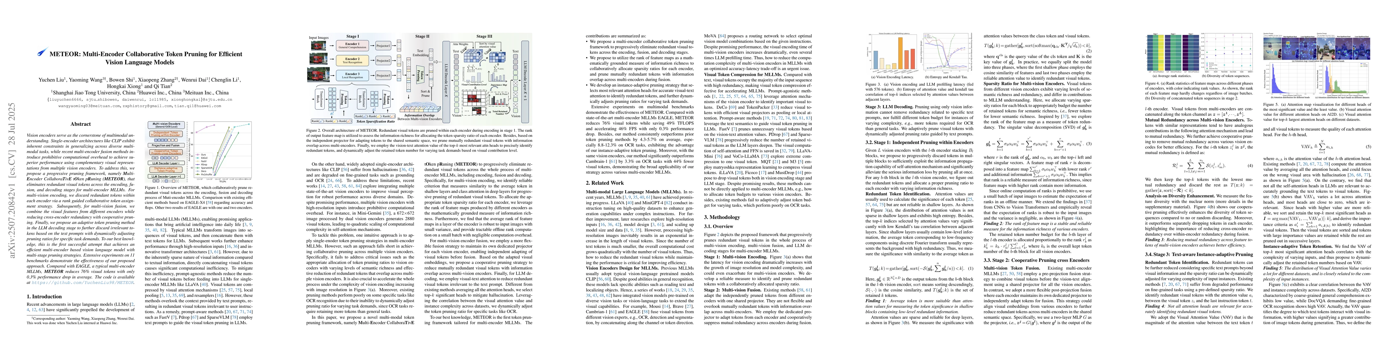 The research introduces METEOR, a multi-stage pruning framework for multi-encoder multimodal language models (MLLM), which includes rank-guided collaborative token assignment for multi-vision encoding, cooperative pruning for multi-vision fusion, and adaptive token pruning for the LLM decoding stage.