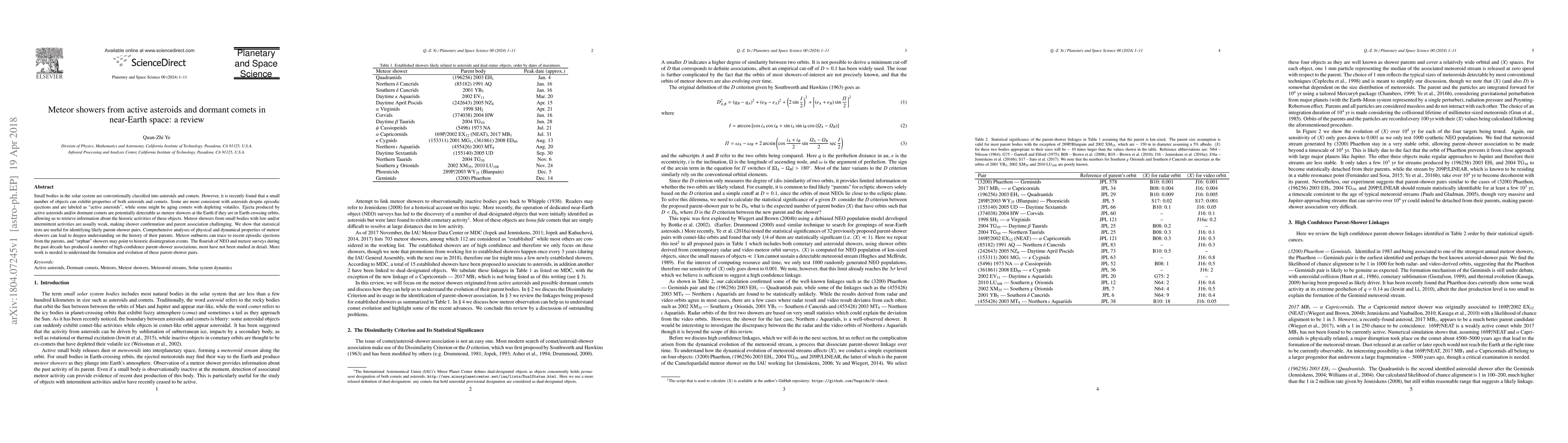 This paper reviews the detection and analysis of meteor showers originating from active asteroids and dormant comets in near-Earth space, highlighting the challenges in confirming parent-shower associations and the potential insights these showers provide into the historical activities of their parent bodies. Statistical tests and comprehensive analyses of meteor shower properties are crucial for understanding these small bodies' formation and evolution.