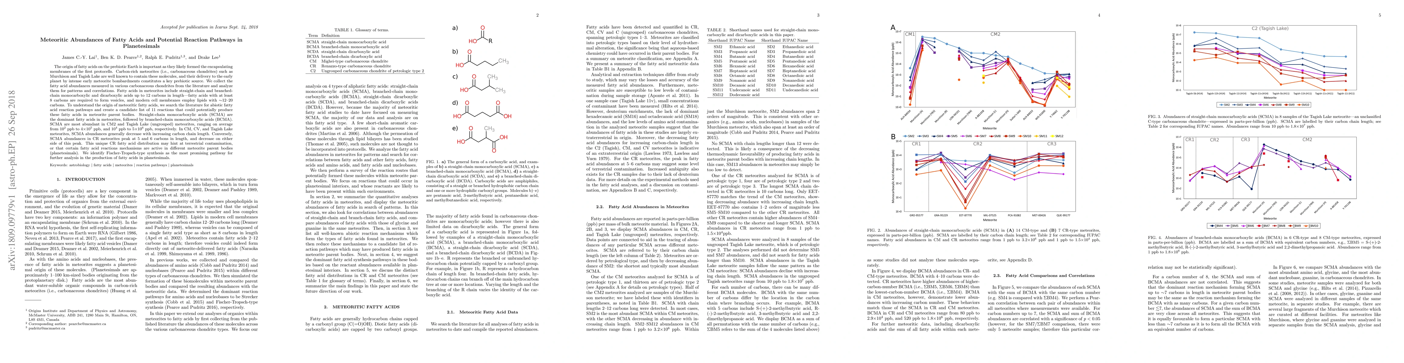 This paper examines the abundances of fatty acids in carbonaceous meteorites and explores potential abiotic reaction pathways for their formation. It identifies straight-chain monocarboxylic acids as the dominant fatty acids, suggesting Fischer-Tropsch-type synthesis as a promising pathway for their production in planetesimals.