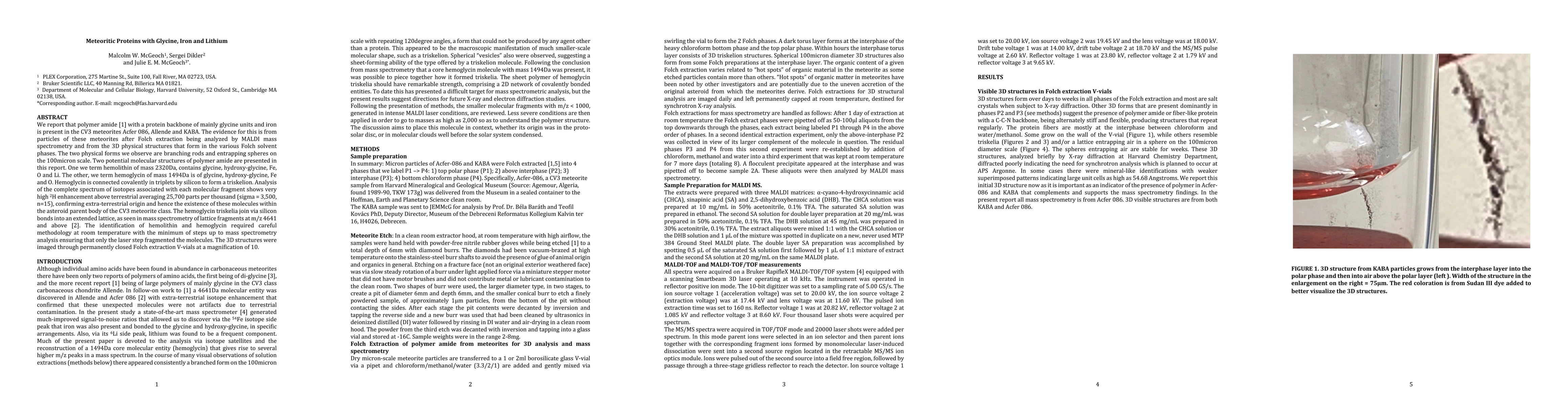 We report that polymer amide [1] with a protein backbone of mainly glycine units and iron is present in the CV3 meteorites Acfer 086, Allende and KABA. The evidence for this is from particles of these meteorites after Folch extraction being analyzed by MALDI mass spectrometry and from the 3D physical structures that form in the various Folch solvent phases. The two physical forms we observe are branching rods and entrapping spheres on the 100micron scale. Two potential molecular structures of polymer amide are presented in this report. One we term hemolithin of mass 2320Da, contains glycine, hydroxy-glycine, Fe, O and Li. The other, we term hemoglycin of mass 1494Da is of glycine, hydroxy-glycine, Fe and O. Hemoglycin is connected covalently in triplets by silicon to form a triskelion. Analysis of the complete spectrum of isotopes associated with each molecular fragment shows very high 2H enhancement above terrestrial averaging 25,700 parts per thousand (sigma = 3,500, n=15), confirming extra-terrestrial origin and hence the existence of these molecules within the asteroid parent body of the CV3 meteorite class. The hemoglycin triskelia join via silicon bonds into an extended lattice, as seen in mass spectrometry of lattice fragments at m/z 4641 and above [2]. The identification of hemolithin and hemoglycin required careful methodology at room temperature with the minimum of steps up to mass spectrometry analysis ensuring that only the laser step fragmented the molecules. The 3D structures were imaged through permanently closed Folch extraction V-vials at a magnification of 10.