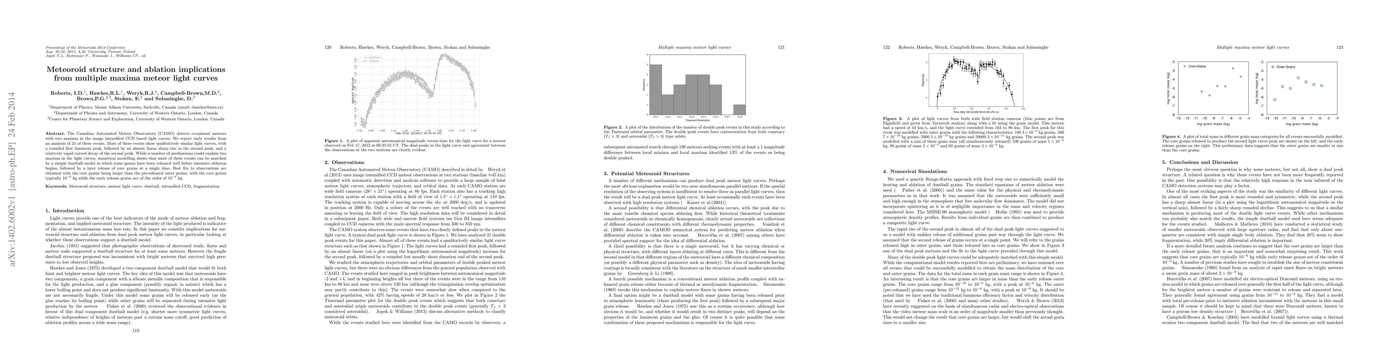 The Canadian Automated Meteor Observatory (CAMO) detects occasional meteors with two maxima in the image intensified CCD based light curves. We report early results from an analysis of 21 of these events. Most of these events show qualitatively similar light curves, with a rounded luminous peak, followed by an almost linear sharp rise in the second peak, and a relatively rapid curved decay of the second peak. While a number of mechanisms could explain two maxima in the light curves, numerical modelling shows that most of these events can be matched by a simple dustball model in which some grains have been released well before intensive ablation begins, followed by a later release of core grains at a single time. Best fits to observations are obtained with the core grains being larger than the pre-released outer grains, with the core grains typically $10^{-6}$ kg while the early release grains are of the order of $10^{-9}$ kg.