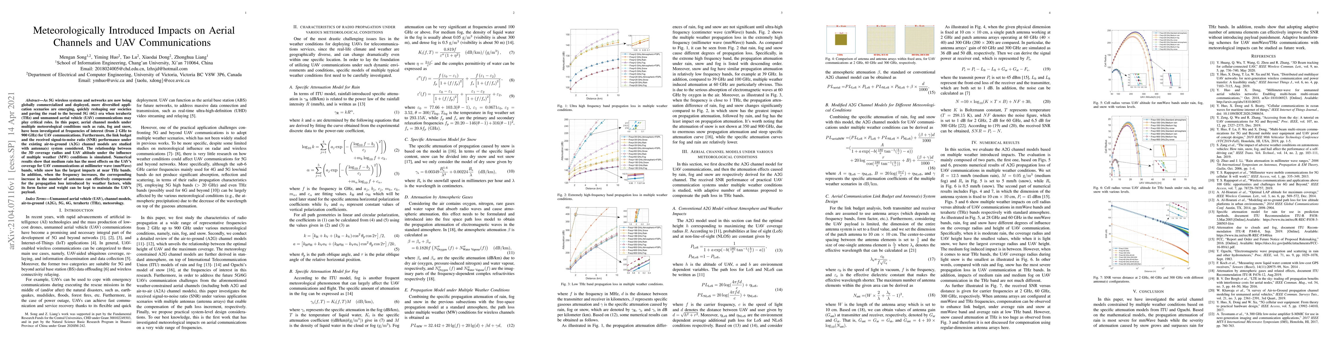 This paper investigates aerial channel models under various meteorological conditions for UAV communications, focusing on frequencies from 2 GHz to 900 GHz. It finds that medium rain significantly impacts UAV coverage at mmWave, while snow has the largest effect at near THz bands, and increasing the number of antennas can mitigate propagation losses due to weather.