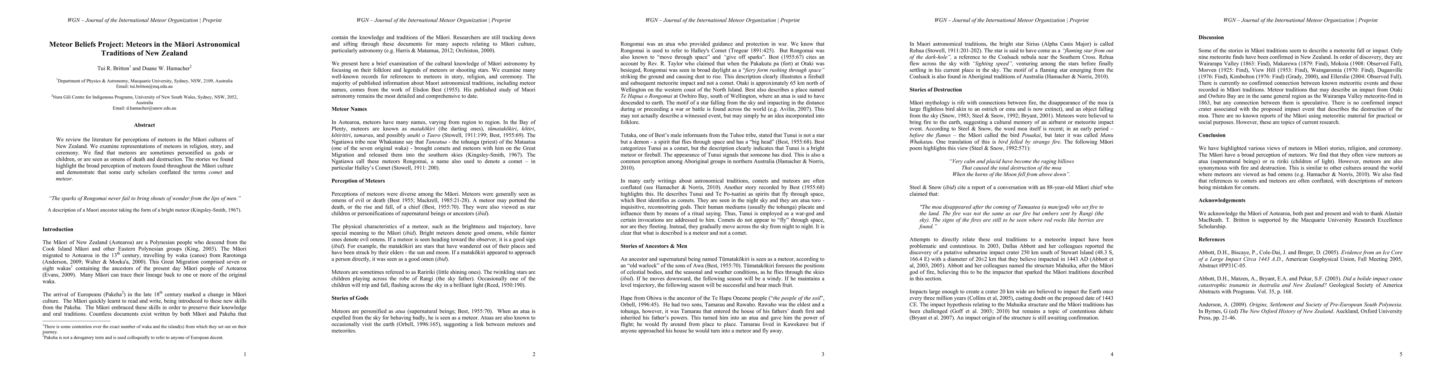 We review the literature for perceptions of meteors in the Maori cultures of New Zealand. We examine representations of meteors in religion, story, and ceremony. We find that meteors are sometimes personified as gods or children, or are seen as omens of death and destruction. The stories we found highlight the broad perception of meteors found throughout the Maori culture and demonstrate that some early scholars conflated the terms comet and meteor.