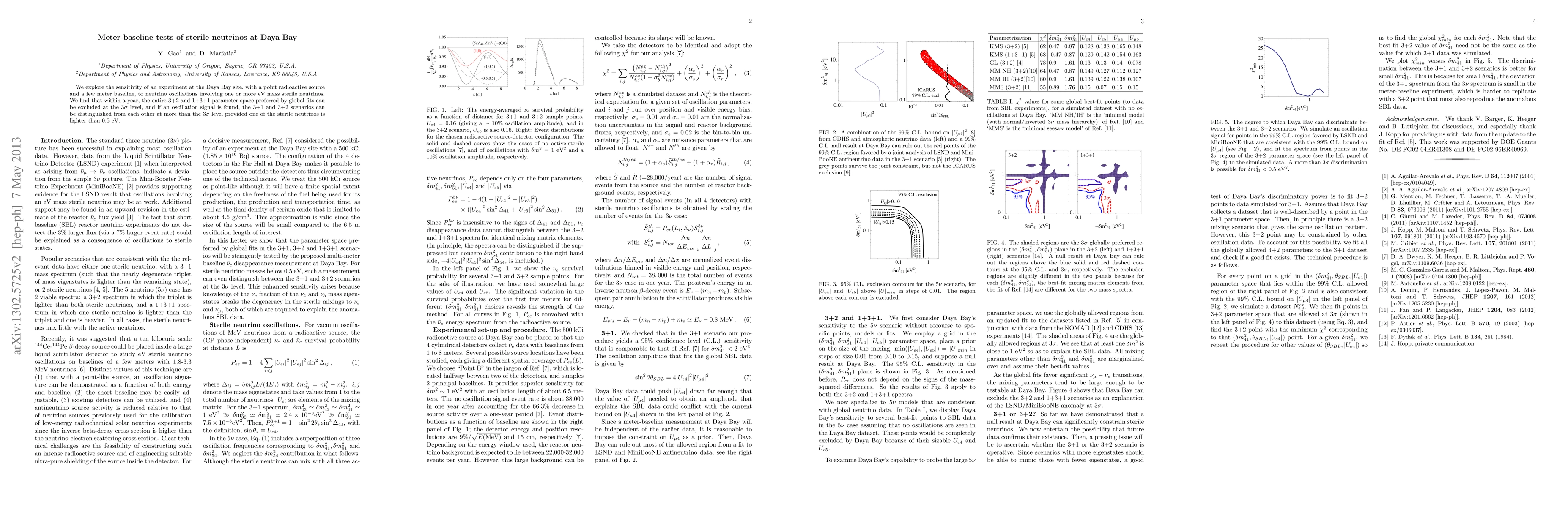 The research proposes a meter-baseline experiment at Daya Bay to test sterile neutrinos, finding that it could exclude 3+2 and 1+3+1 parameter spaces within a year, and differentiate 3+1 and 3+2 scenarios if a sterile neutrino is lighter than 0.5 eV.