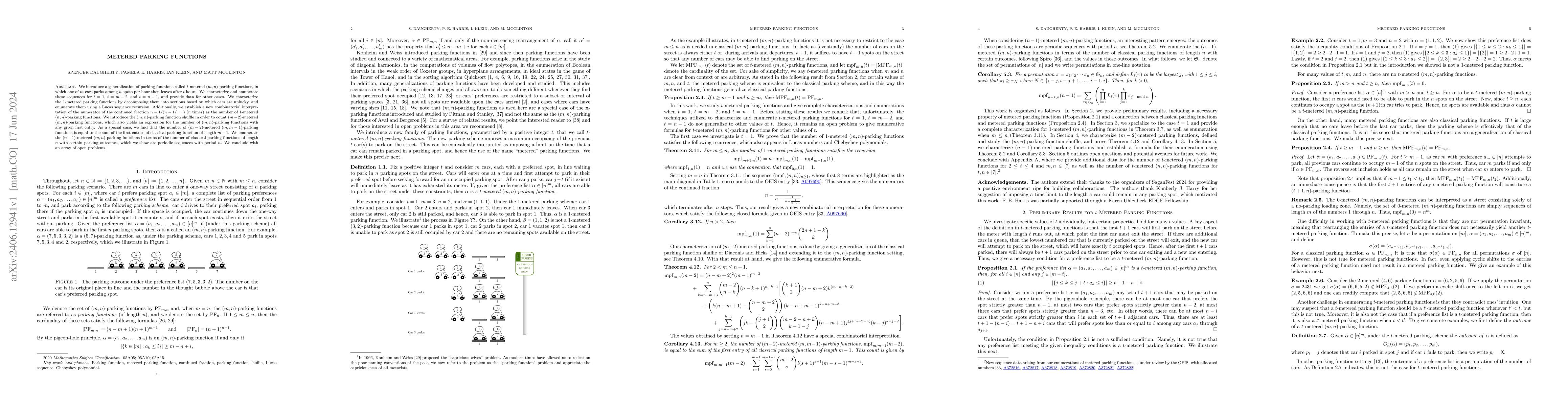 The paper presents novel enumeration techniques and combinatorial interpretations for specific cases of $t$-metered parking functions, linking them to Lucas sequences and Chebyshev polynomials.