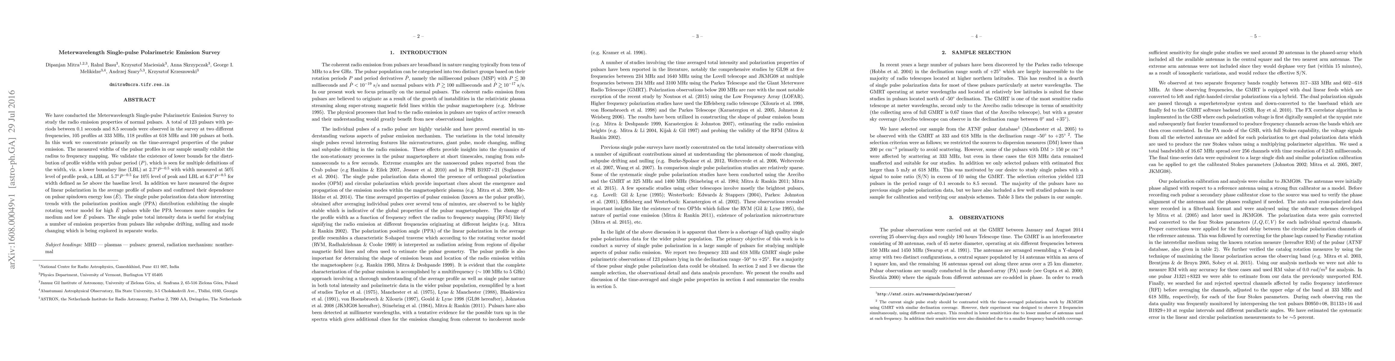 This study surveys the radio emission properties of 123 normal pulsars using meterwavelength single-pulse polarimetric emission data, revealing lower bounds for profile widths and confirming the dependence of linear polarization on pulsar spindown energy loss. The polarization position angle trends align with the rotating vector model for high spindown energy loss pulsars.
