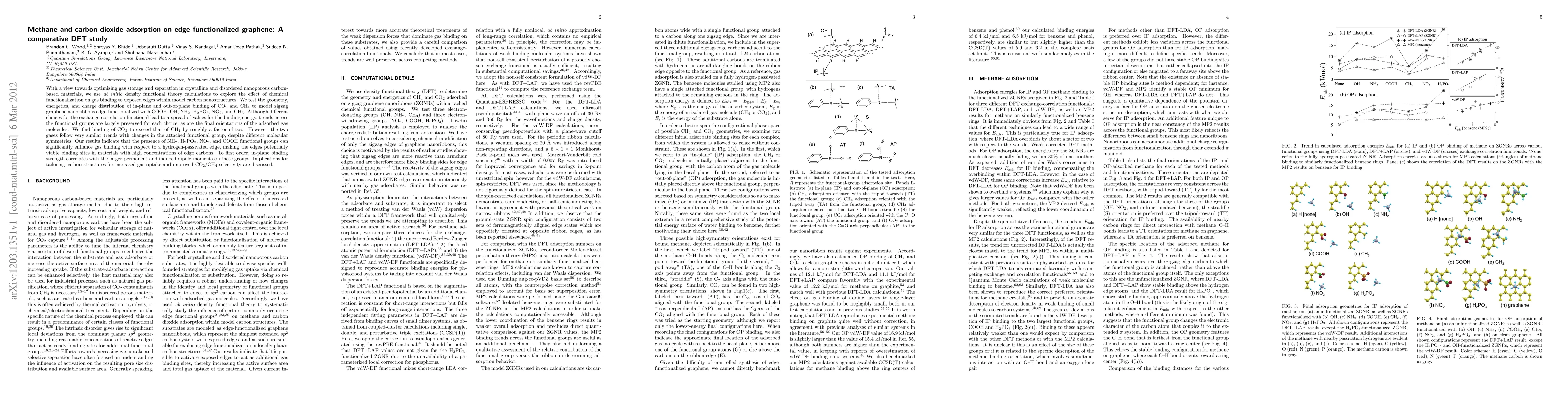 With a view towards optimizing gas storage and separation in crystalline and disordered nanoporous carbon-based materials, we use ab initio density functional theory calculations to explore the effect of chemical functionalization on gas binding to exposed edges within model carbon nanostructures. We test the geometry, energetics, and charge distribution of in-plane and out-of-plane binding of CO2 and CH4 to model zigzag graphene nanoribbons edge-functionalized with COOH, OH, NH2, H2PO3, NO2, and CH3. Although different choices for the exchange-correlation functional lead to a spread of values for the binding energy, trends across the functional groups are largely preserved for each choice, as are the final orientations of the adsorbed gas molecules. We find binding of CO2 to exceed that of CH4 by roughly a factor of two. However, the two gases follow very similar trends with changes in the attached functional group, despite different molecular symmetries. Our results indicate that the presence of NH2, H2PO3, NO2, and COOH functional groups can significantly enhance gas binding with respect to a hydrogen-passivated edge, making the edges potentially viable binding sites in materials with high concentrations of edge carbons. To first order, in-plane binding strength correlates with the larger permanent and induced dipole moments on these groups. Implications for tailoring carbon structures for increased gas uptake and improved CO2/CH4 selectivity are discussed.