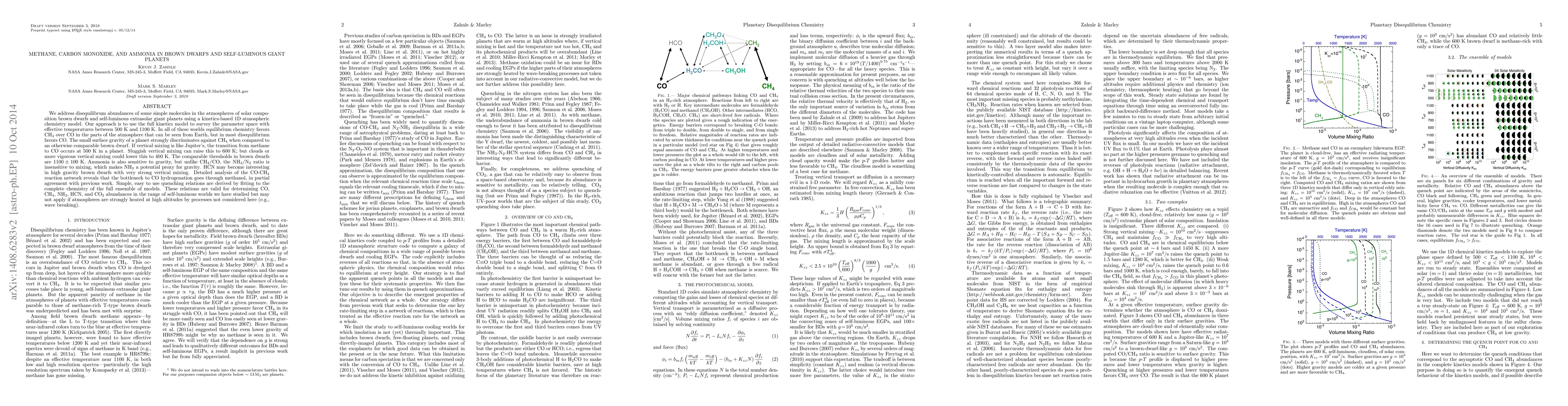 This paper investigates the disequilibrium abundances of methane, carbon monoxide, and ammonia in the atmospheres of solar composition brown dwarfs and self-luminous giant planets using a kinetics-based model. It finds that while equilibrium chemistry favors methane, disequilibrium often favors carbon monoxide, with gravity strongly influencing these abundances.